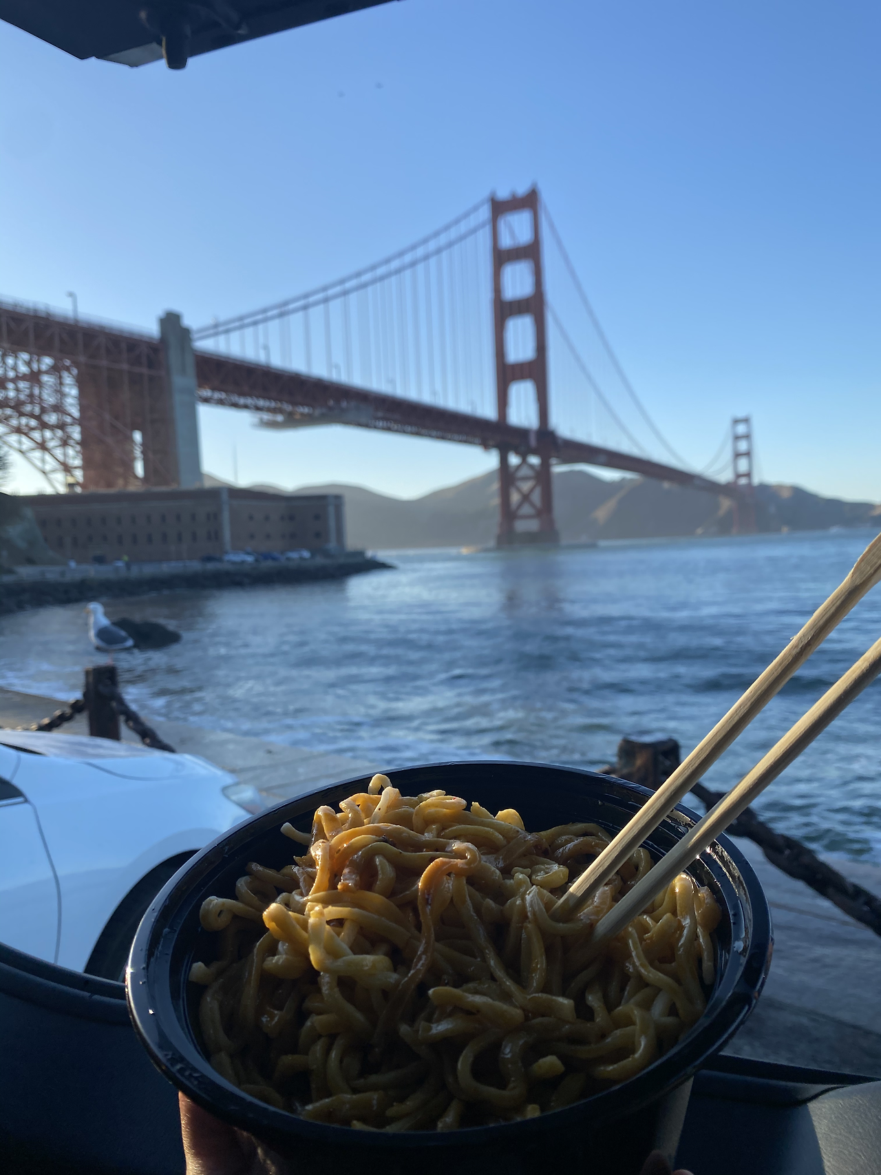 저녁시간 사람이 많이 없는 골든게이트 브리지 밑에 차를 세웠다. 트렁크에서 전망을 바라보며 입안이 얼얼해지는 댄댄누들을 먹었다. 사람도 별로 없었지만 트렁크 안이라 사람들과 부딪힐 걱정 없고, 차가운 바닷바람도 어느 정도 막아줘 아늑했고, 지는 해와 골든게이트 브릿지는 정말 멋졌다.