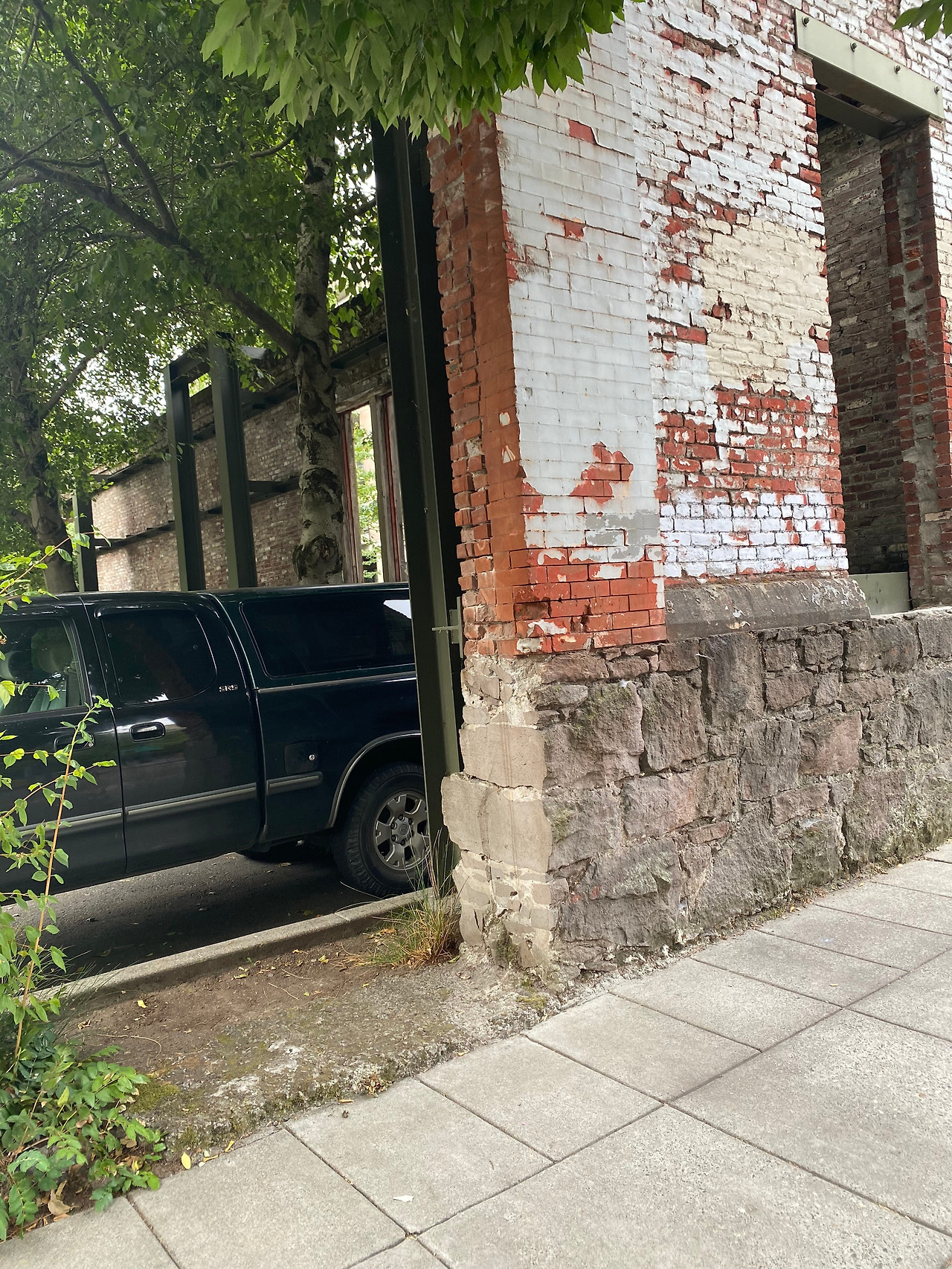*오래된 건축물에 철근을 대어 사용 중인 건물, 주차장 끝 벽, 벽돌만 한 면 정도 남아 있어도 철근을 대어 그 오래된 벽을 유지하고 있다.