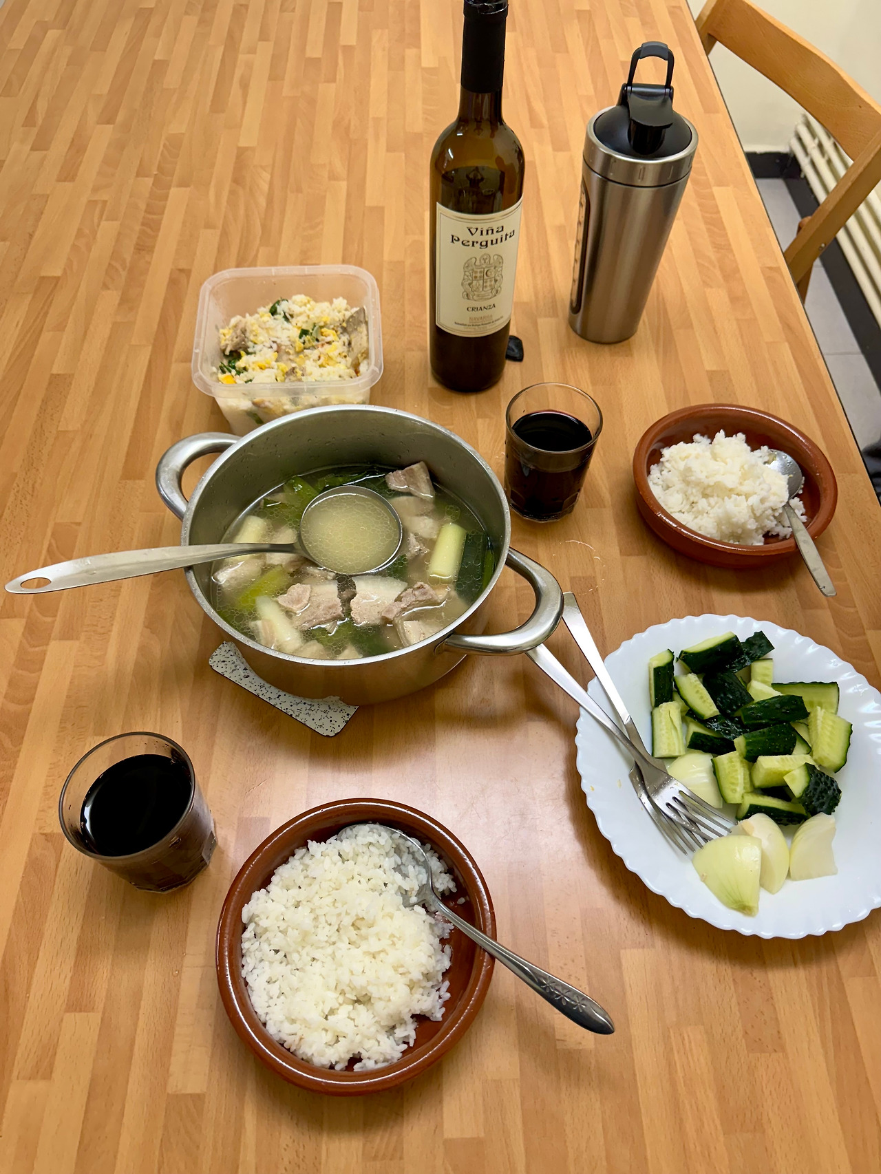 오늘은 빨래를 하지 않았다. 선선한 날씨 덕에 땀이 거의 안 나기도 했거니와 어차피 내일 다시 입을 옷이기도 하다. 저녁을 직접 요리해 먹기 위해 손빨래에 소비되는 체력을 아끼려 한 연유도 있다. 걷다가 돼지국밥이 먹고 싶다고 했더니 아내가 야채로 우린 채수에 돼지고기를 넣고 삶기만 하면 된다며 걱정 말라고 했다. 샤워를 마치고 숙소 근처 마트에서 구입한 재료들로 뚝딱 요리를 완성했다. 한국에서 먹던 맛은 아니었지만 제법 그럴듯했다. 오히려 야채와 돼지고기가 신선해서인지 국물이 깔끔하고 담백했다. 식사 도중 다른 순례객도 저녁거리를 들고 와서 우리 옆에 앉았다. 이런저런 얘기를 하다 음식을 조금 나눠 주었더니 너무 맛있다며 아내에게 조리법을 물어보았다. 내가 만든 음식도 아닌데 뿌듯했다. 아내는 요리 천재인 듯하다. 국밥과 찰떡인 소주까지 마련되어 있었더라면 한잔 따라주며 한국의 맛을 더 확실하게 알렸을 텐데 하는 아쉬움이 들었다.