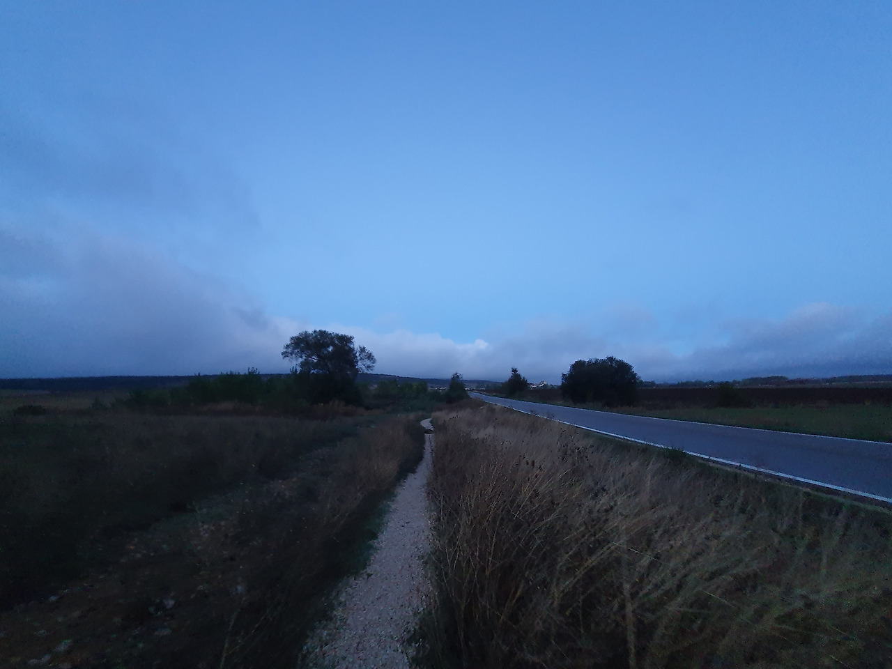 그렇게 정신없이 걷다가 전방 시야를 확보하기 위해 앞을 잠깐 비췄는데 깜짝 놀라 제자리에 멈춰 서고 말았다. 정확히는 얼어붙었다는 표현이 맞겠다. 사람이 너무 크게 당황하면 아무 소리도 나오지 않는다고 하는데 내가 딱 그랬다. 눈앞에 새까맣고 거대한 무언가가 놓여있었다. 얼핏 짧고 굵은 검정 털이 덮여 있는 것으로 보아 동물 같았다. 땅만 보며 걷던 아내는 내 가방에 부딪히고서야 멈췄다. 숨죽이며 핸드폰 조명으로 다시 비추었다. 멧돼지였다. 움직임이 없는 것으로 보아 자고 있거나 죽은 듯했다. 우리보다 앞서 출발한 순례자들도 있을 텐데 계속 그 자리에 있는 것을 보면 후자 쪽일 확률이 높다. 정황상 바로 옆 도로를 건너다 차에 치여 즉사한 사체를 운전자가 순례길 위로 옮겨 놓은 듯했다. 안타까운 마음이 들었다. 침착함을 되찾자 그제야 날이 밝아졌다. 걸어온 길을 되돌아가 우회했다.