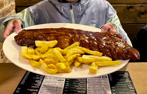 간단히 정비를 마치고 저녁을 먹으러 나갔다. 평점이 괜찮은 식당에 들어가 돼지 등갈비와 부리또를 주문했다. 얼마 후 음식이 나왔는데 둘 다 눈이 휘둥그레졌다. 등갈비의 크기가 어마어마했다. 옆에서 식사를 하던, 그리고 마침 식당 안으로 들어오던 순례자 친구들도 고기를 보고는 똑같은 반응을 보였다. 갈빗대와 살이 쉽게 분리될 정도로 푹 삶아졌고 양념의 간도 적당했다. 다 먹기에는 양이 많아 남은 부리또는 또르띠야와 함께 내일 먹기로 했다.
