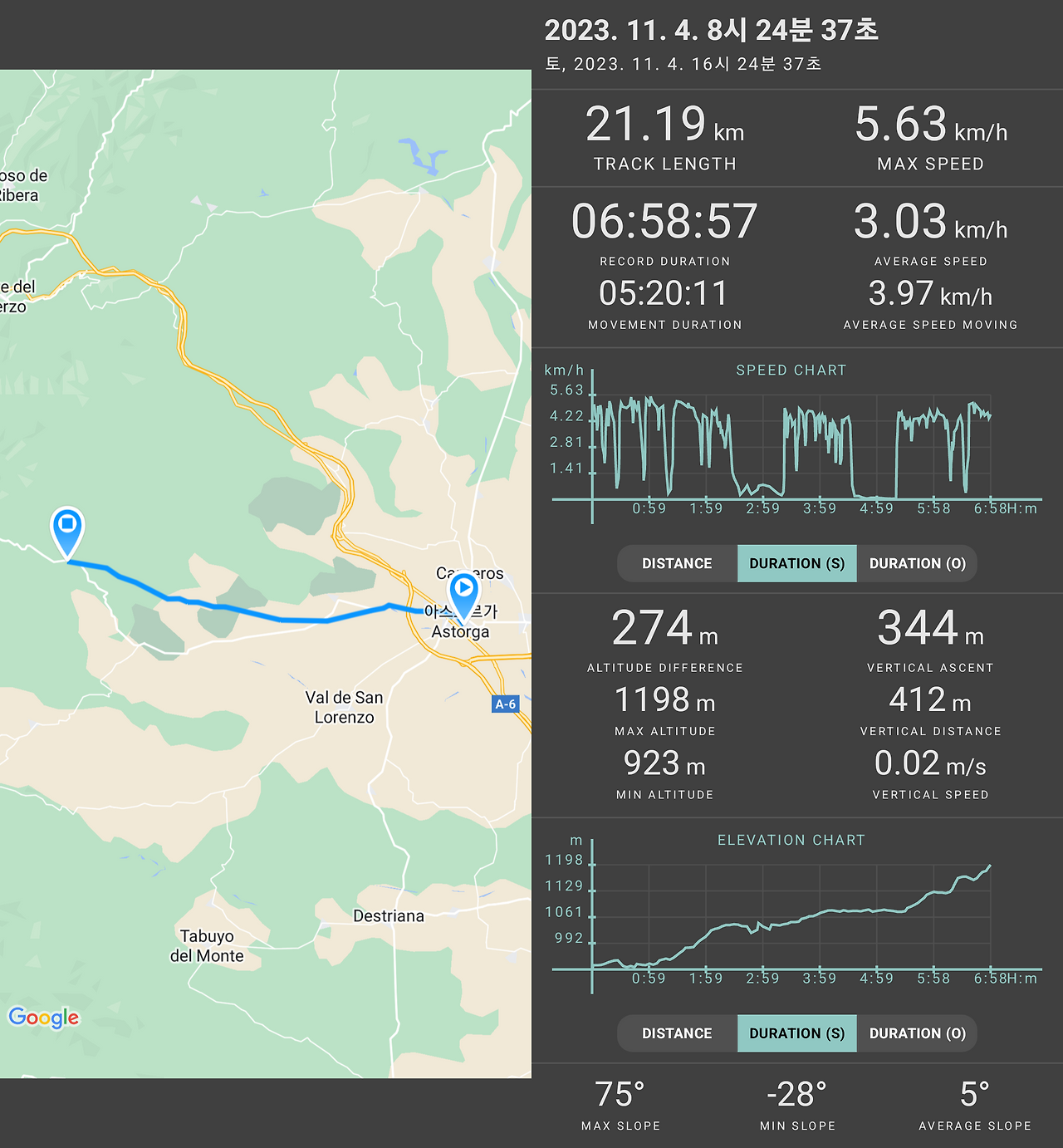 역대급 최악의 날씨로 인해 걷는 내내 정말 힘들었다. 가느다란 빗줄기가 하루 종일 떨어져 우비를 벗을 수 없었다. 날이 갑자기 푸근해지는 바람에 걸을수록 몸에서 점차 열이 올라왔다. 비옷 안에 갇힌 습한 열기는 겨드랑이와 등에 땀을 맺히게 만들었다. 중간중간 가던 길을 멈추고 옷가지들을 하나씩 벗어야 했다. 어제까지 그렇게 춥더니 당최 갈피를 못 잡겠다. 오후가 되자 고개를 들 수 없을 정도의 거센 바람이 우릴 향해 불어왔다. 강한 역풍을 뚫고 오르막길을 오르는 동안 뒤에서는 뜨거운 햇빛이 내리쬐고 앞에서는 빗방울이 시야를 가렸다.