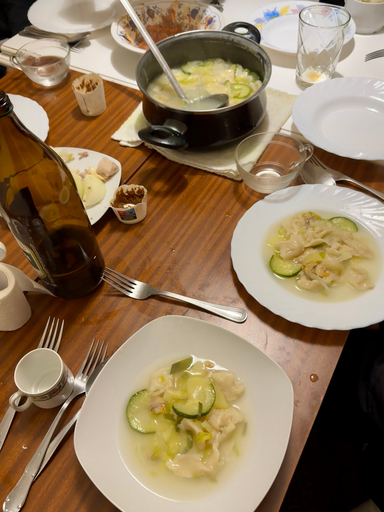 1차로 돼지고기 수육, 해물파전 그리고 감자전을 먹었다. 신선한 돼지고기는 푹 삶아져 제법 두껍게 썰어냈음에도 부드럽게 씹혔다. 양파, 마늘, 대파 등으로 우려낸 채수가 잡내를 잡아 주어 담백한 맛이 일품이었다. 오징어가 들어간 해물파전은 간이 적당하여 간장 없이도 막걸리와 환상적인 궁합을 뽐내었다. 순식간에 접시가 비워졌고 이어서 냄비 가득 끓인 수제비로 2차 저녁식사를 시작했다. 반죽이 잘 숙성되어 쫄깃한 식감이 느껴졌고 국물도 제법 구수했다. 힘들고 긴 여정을 동행하며 정서적 유대관계가 끈끈하게 형성된 사람들과 함께 먹어서인지 더욱 맛있게 느껴졌다.