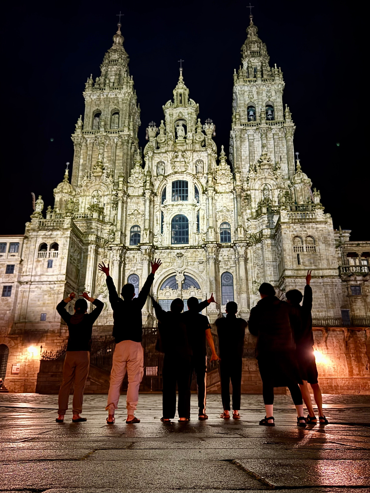 식사를 마치고 분위기를 전환하고 싶었다. 숙소 위치가 산티아고 대성당에서 멀지 않았다. 산책 삼아 성당 앞을 다녀오자고 제안했다. 모두들 흔쾌히 수락해 주어 어둠이 짙게 깔린 거리를 지나 성당으로 향했다. 늦은 저녁이었기에 발소리를 신경 쓰며 조용히 걸었다. 낮에 비가 오는 바람에 성당 앞을 제대로 구경하지 못해 아쉬웠는데 다행히 비는 그쳐 있었다. 밤이라 성당이 잘 보이지 않을 것이라는 염려와는 다르게 밝은 조명이 성당을 환히 비추고 있었다. 장관이었다. 사람이 없어 누구의 방해도 받지 않고 마음껏 포즈를 취하며 기념사진을 남겼다.