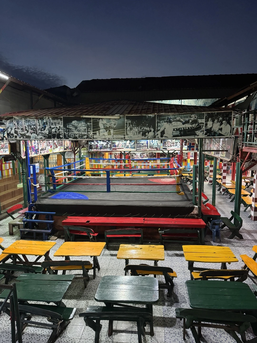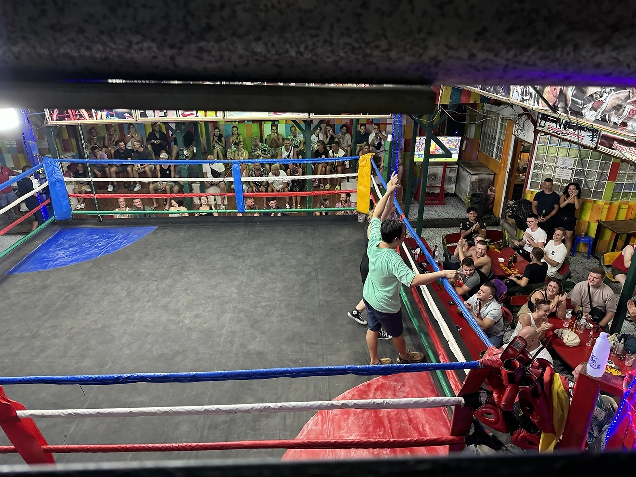 사실 오늘 묵는 곳은 바(Bar)와 숙박시설을 겸업하는 곳이다. 그리고 1층에 자리 잡은 바는 태국의 전통무술인 무에타이(Muay Thai)를 컨셉으로 한다. 늦은 저녁 시간이 되면 식사를 마친 관광객들이 하나 둘 모여들기 시작한다. 어느 정도 사람이 모이고 나면 직원이 바의 중앙에 자리한 링에 올라가서 경기에 참가할 손님을 찾기 시작한다. 먼저 누군가 손을 들고 참가의사를 밝히면 그 사람을 링 위로 부른다. 직원은 용감한 손님의 손을 잡고 링을 한 바퀴 돌며 앉아있는 다른 손님들에게 물어본다. 이 사람과 경기를 하고 싶은 상대가 있는지. 앉아있는 무리 중에 또 누군가 손을 들면 그 둘은 경기가 성사되는 방식이다. 용기를 낸 두 명의 참가자들은 각각 작은 메달과 버킷(Bucket)이라 불리는 칵테일을 파이트머니로 받는다. 경기 참가자들은 두꺼운 복싱 글러브와 헤드기어를 장착하고 복싱 규칙으로 겨룬다. 발차기와 박치기 공격이 금지되고 후두부와 낭심 가격도 금지다. 총 2라운드를 진행하고 각 라운드는 1분이 주어지며 라운드 사이에는 2분의 휴식시간이 주어진다. 무에타이는 원래 발차기 공격을 주로 사용하지만 일반인이 사용하기에는 부상의 위험이 높기 때문에 금지한 것으로 보인다.