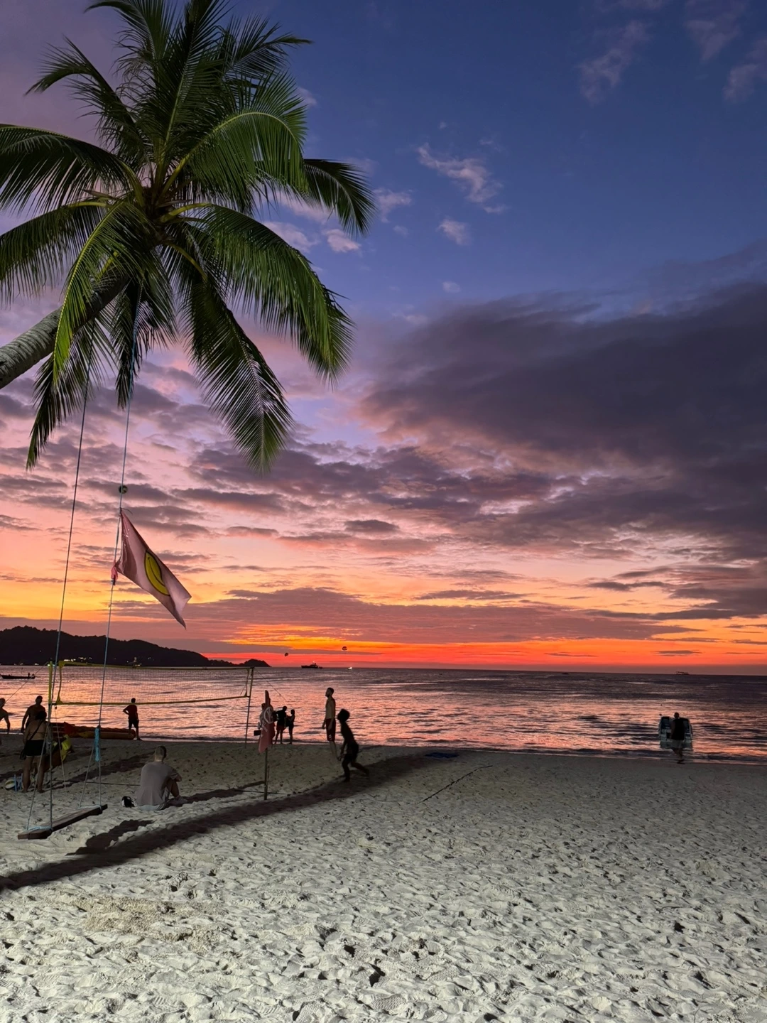 늦은 오후가 되면 사람들은 석양을 감상하기 위해 가던 길을 멈춘다. 우리가 푸켓에서 머문 파통 해변은 서쪽을 바라보고 있다. 그래서 아쉽게도 일출은 볼 수 없었다. 해가 수평선 바로 위까지 내려간 즈음부터 하늘은 다채롭게 변한다. 파란 하늘은 붉은색, 주황색, 노란색으로 그라데이션을 이루다 보라색을띠고 난 후 차츰 검게 어두워진다. 수평선 근처에 야자수와 작은 섬을 배경으로 보이는 실루엣도 멋지다.