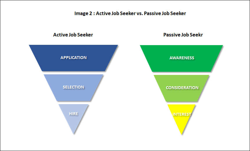 활동적인 지원자의 경우, 채용 단계 이전까지 지원자는 입사하고자 하는 회사에 지원(Application)하고, 그 후 회사를 선택(Selection), 채용(Hire)이라는 과정을 거치게 됩니다. 반면, 수동적인 지원자의 경우, 기업의 인재영입 과정 중 첫 번째로 회사에 대한 인지(Awareness), 두 번째로 회사에 대한 고려(Consideration)하는 단계를 거쳐 관심(Interest)을 갖는 단계를 도달하게 됩니다.