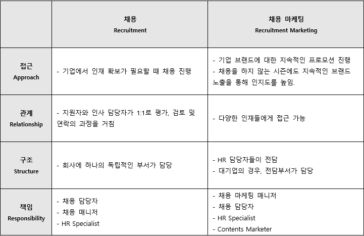 우리가 알고 있는 기존의 채용 방식은 구직자가 입사하고자 하는 회사에 지원하고, 채용 또는 인사 담당자가 지원자를 1:1로 평가, 검토 및 연락하는 과정을 거쳐왔습니다. 그러나 이와 같은 채용 방식은 더 이상 인재를 영입하는데 효율적이지 않습니다. 시대와 상황에 따라 변화하는 채용시장에 맞춰 채용방식 또한 변화를 필요로 하고 있습니다. 그 과정에서 기업은 채용시장의 다양한 인재들에게 접근할 수 있도록 채용 마케팅이라는 전략을 사용하고 있습니다.