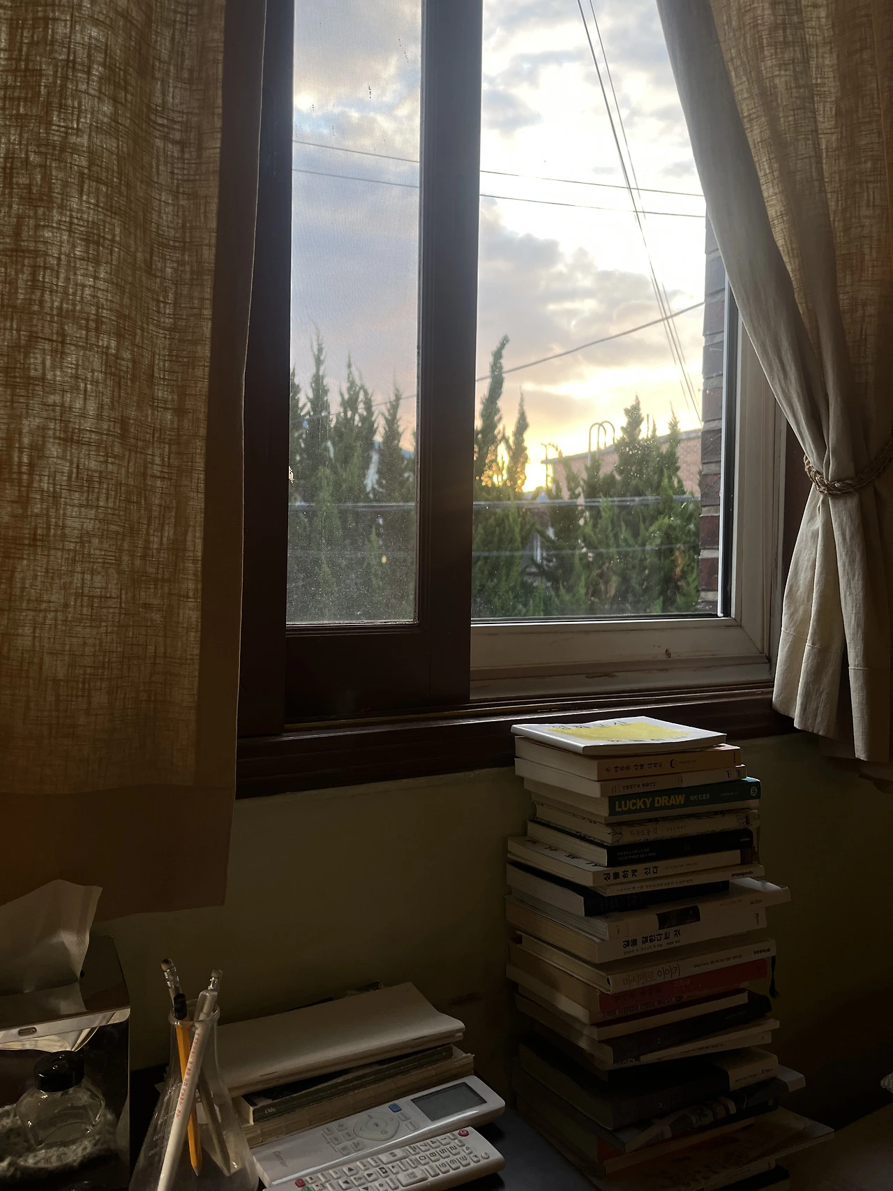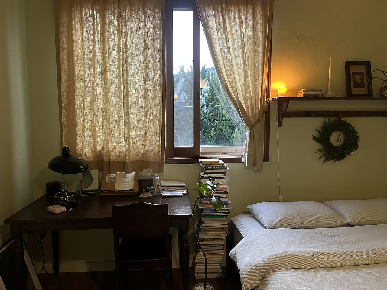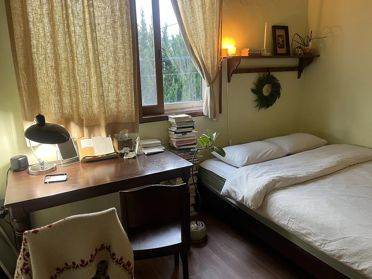 원목의 1인용 책상과 그곳에 배경을 만들어 주는 창문, 탁상 옆 가지런히 쌓인 책들과 그 옆을 채우는 포근하고 큰 침대까지. 창가에 다가갔을 때, 바람에 흔들리는 초록 잎들의 살랑거림은 나를 더욱이 설레게 했다.