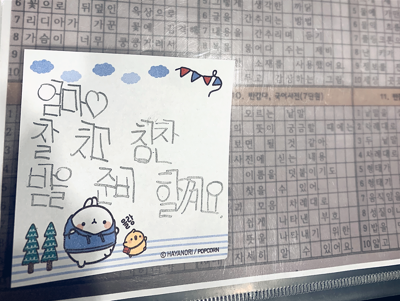 꿀이 뚝뚝 떨어지는 이런 메모는 보고만 있어도 달달하다. '께'든 '꼐'든 모간에게는 '깨'가 쏟아지는 순간이다. 엄마의 잔소리를 사랑으로 돌려주는 애지, 모간은 이런 사랑 앞에서 뜨거움을 느낀다.