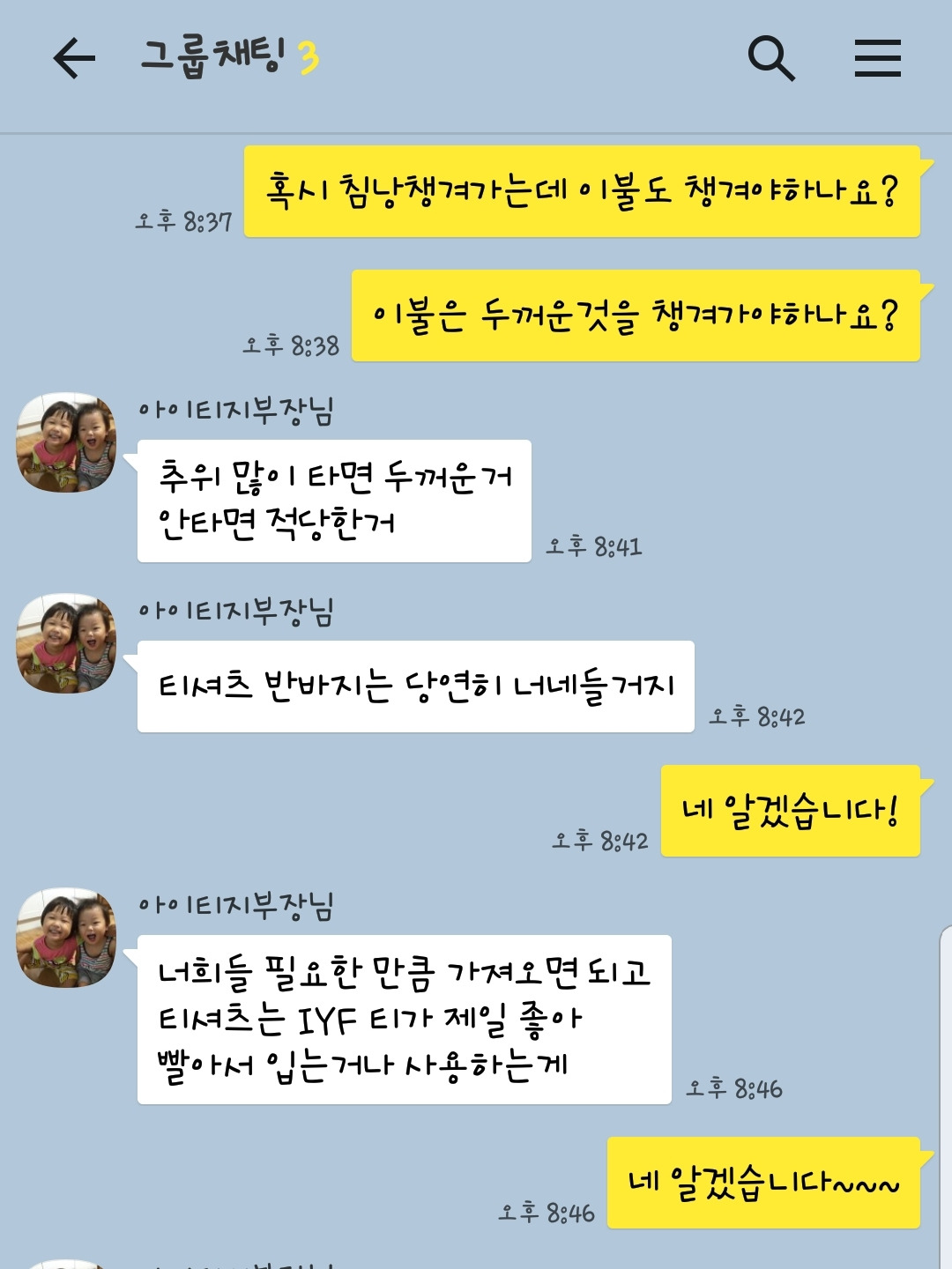 "전기가 자주 나가니까 충전용 손전등을 꼭 사오세요."