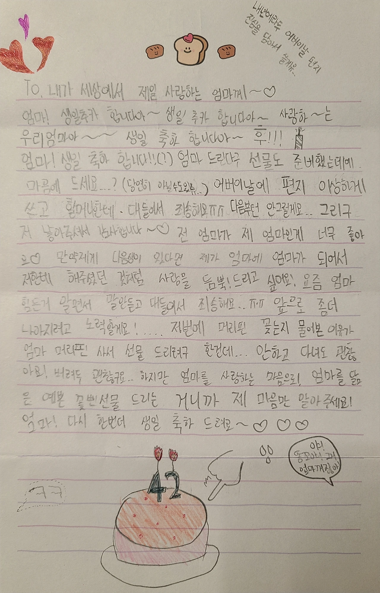 "꼭! 엄마 집에 가서 읽으세요-"라고 쓰인 봉투를 열었더니 빼곡한 글씨로 채워진 편지가 있다.