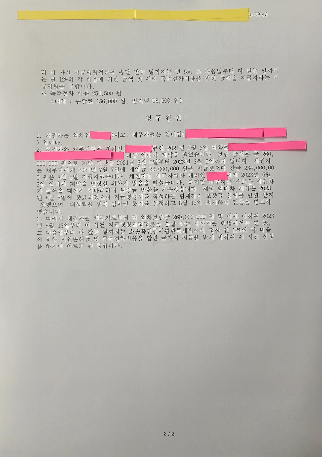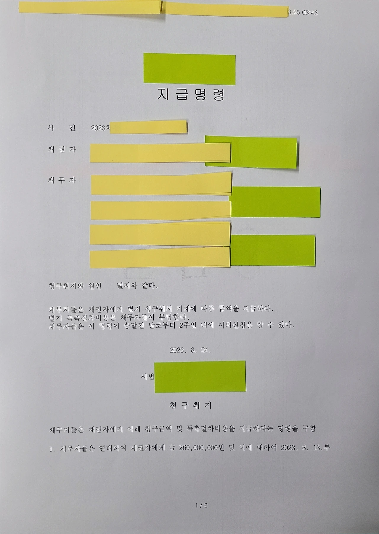 개인정보유출 주의 문구를 포함하여 다 가린 지급명령