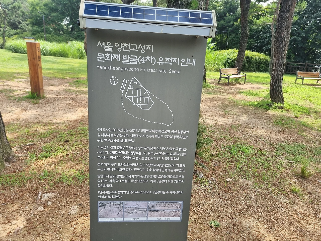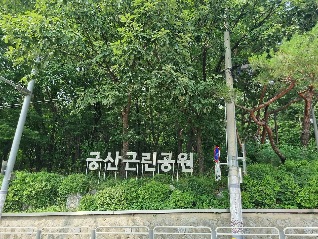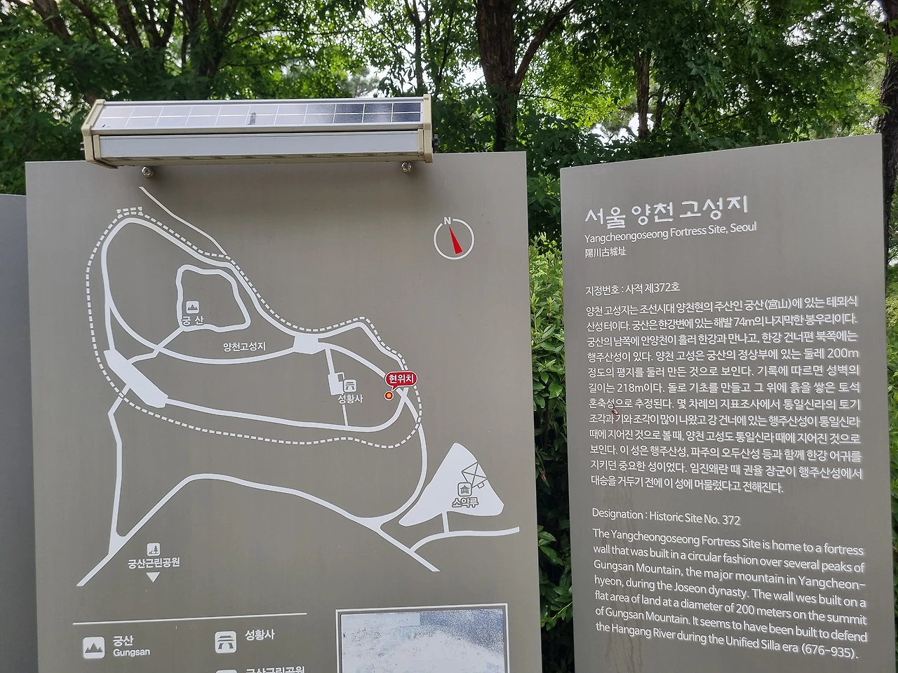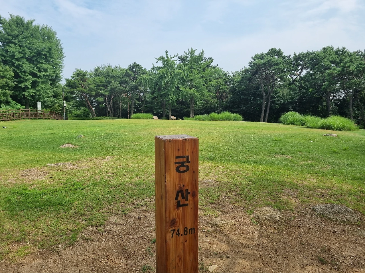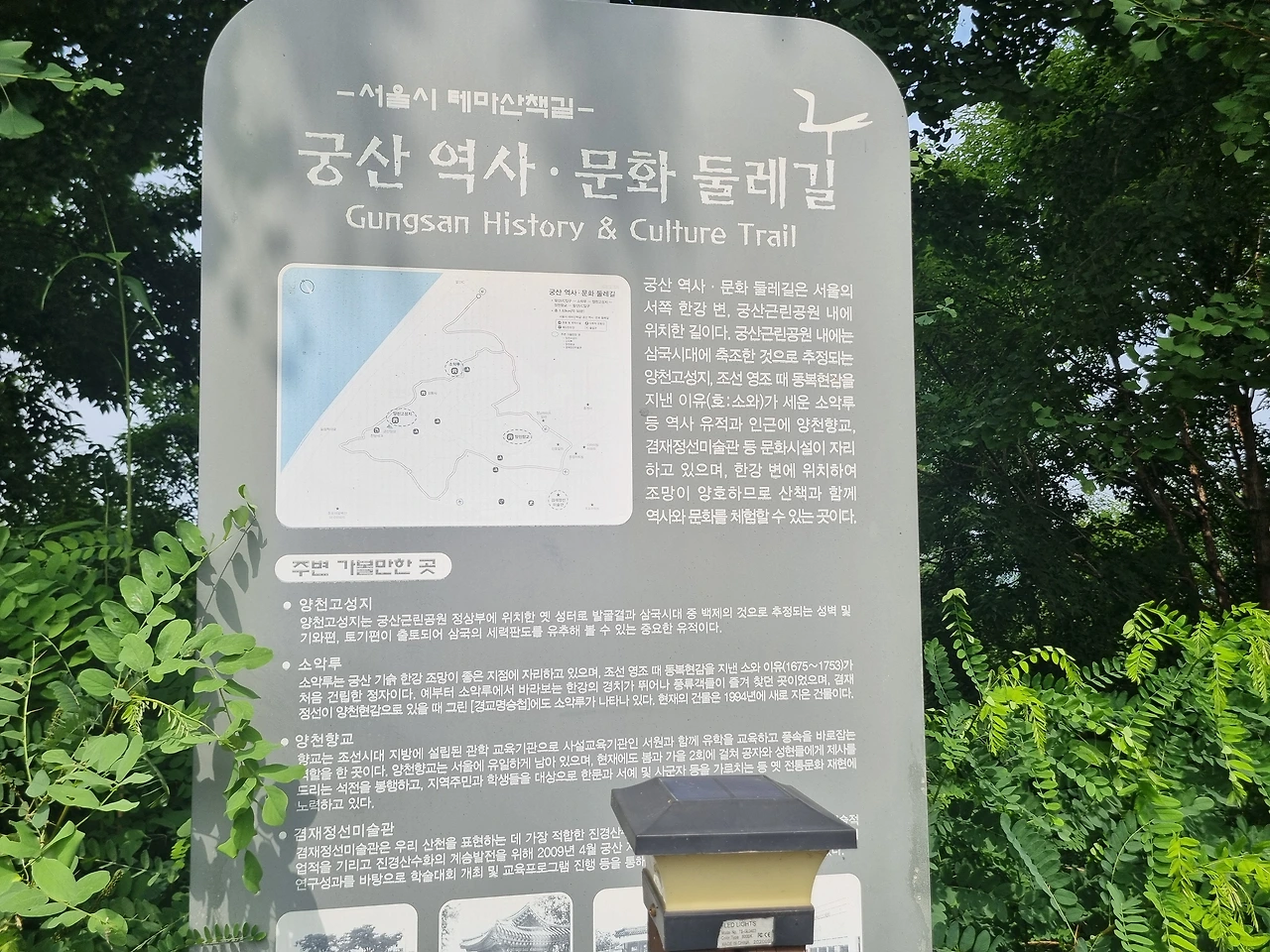 해봄 정원, 습지생태공원을 지나 강변도로 육교로 한강변 산책도로로 접어들어, 동쪽으로 지상 공항철도를 지나 걸으니 지하로 마곡나들목이 있다. 바로 왼쪽을 끼고 야산에 오르다. 궁산(74m) 공원이다. 정상에 산성터,