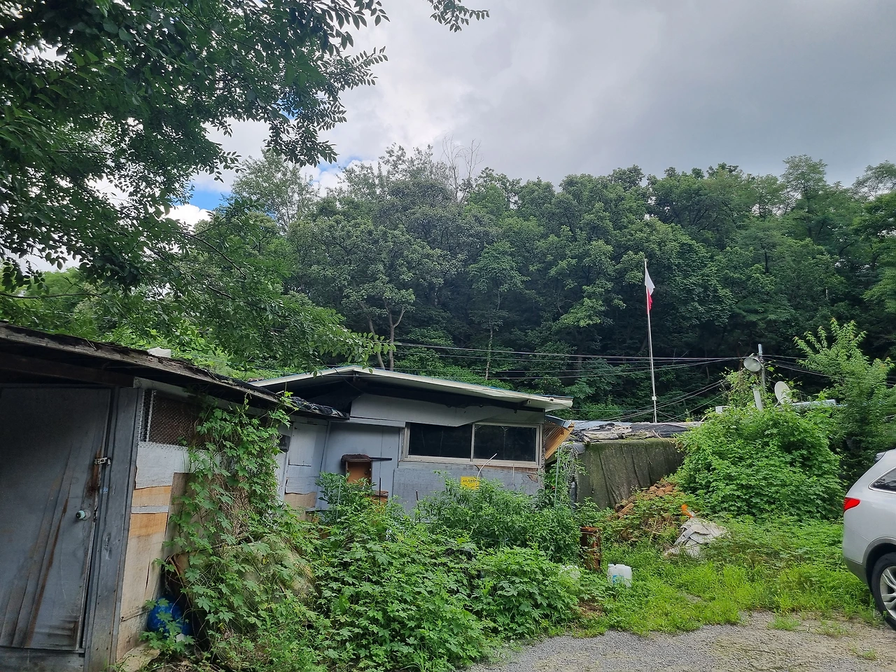 경계 표시인 듯한 임시 담벼락의 판대기들.