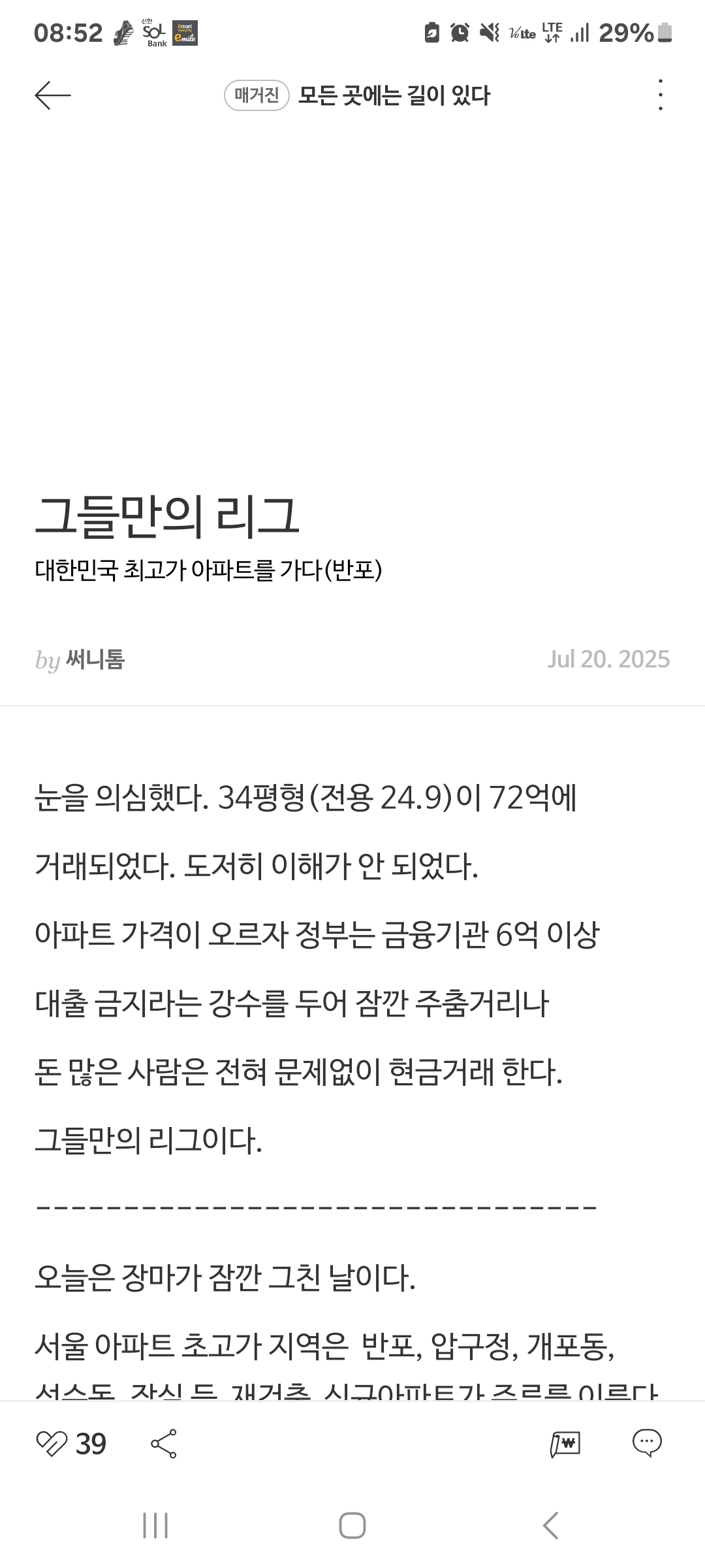 지금 한국에서 가진 자만의 잔치, 초고가 아파트에 관한 이야기를 7.20 브런치에 게재했다.