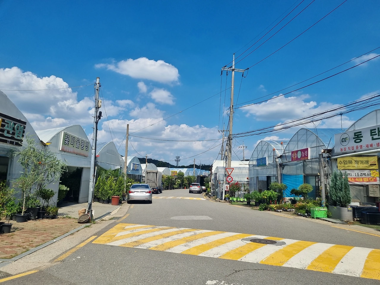 길가에는 화분용 조경수를 파는 비닐하우스가 있고