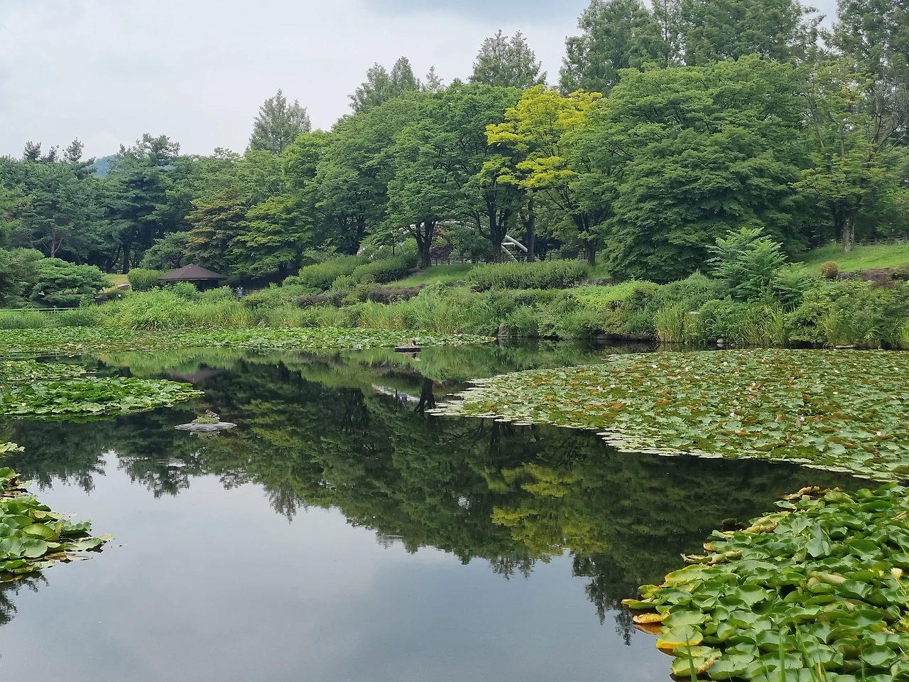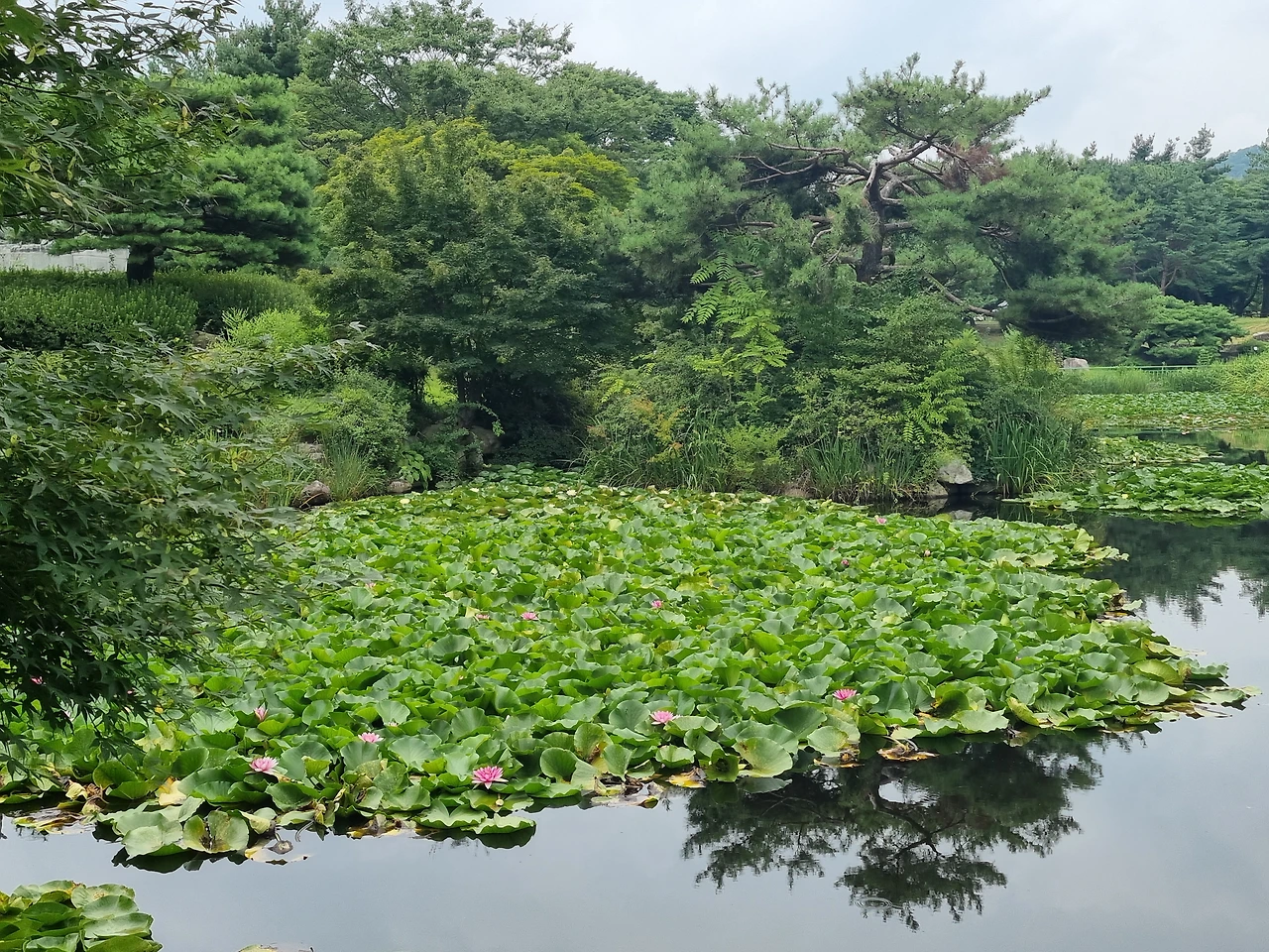 다양한 색상의 수련 꽃이 드문드문 피어있다.