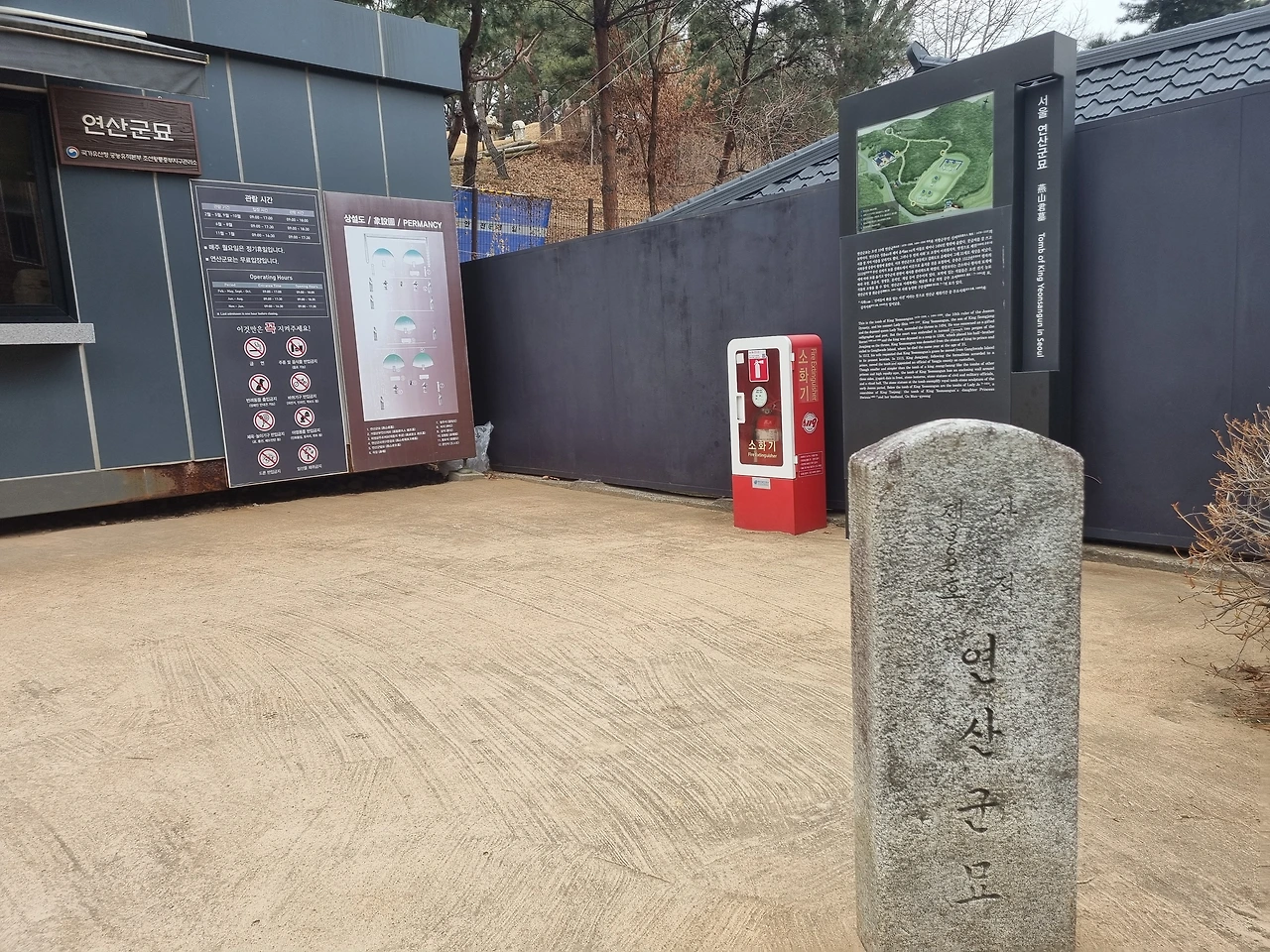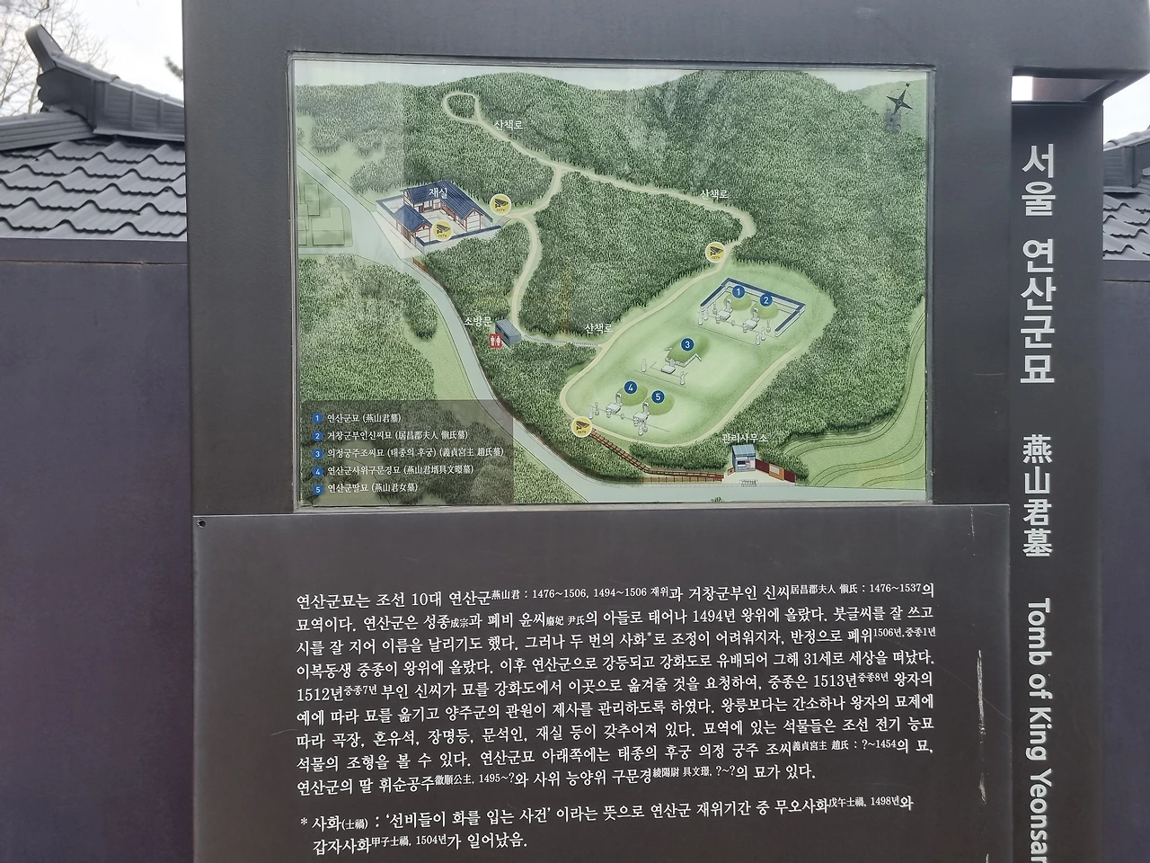 연산군묘는 왕릉보다 간소하나 왕자의 묘제에 걸맞게 석물을 설치하였다. 그 밑에는 태종의 후궁, 의정궁주 조 씨, 연산군 딸과 사위묘가 아래로 있다