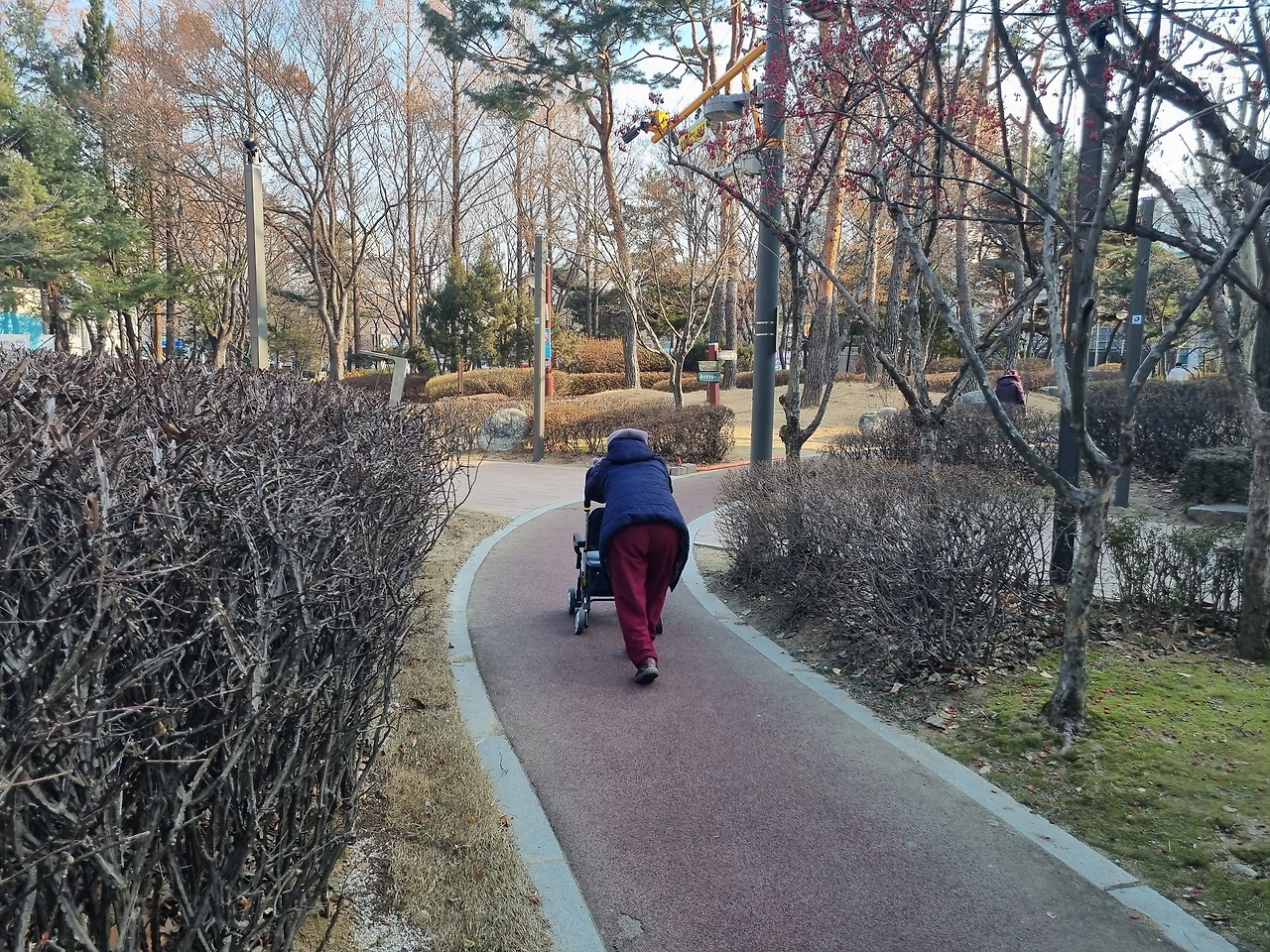 집을 나서 당산공원에 가보니 보행기 끄는 할머니가 열심히 운동을 한다.