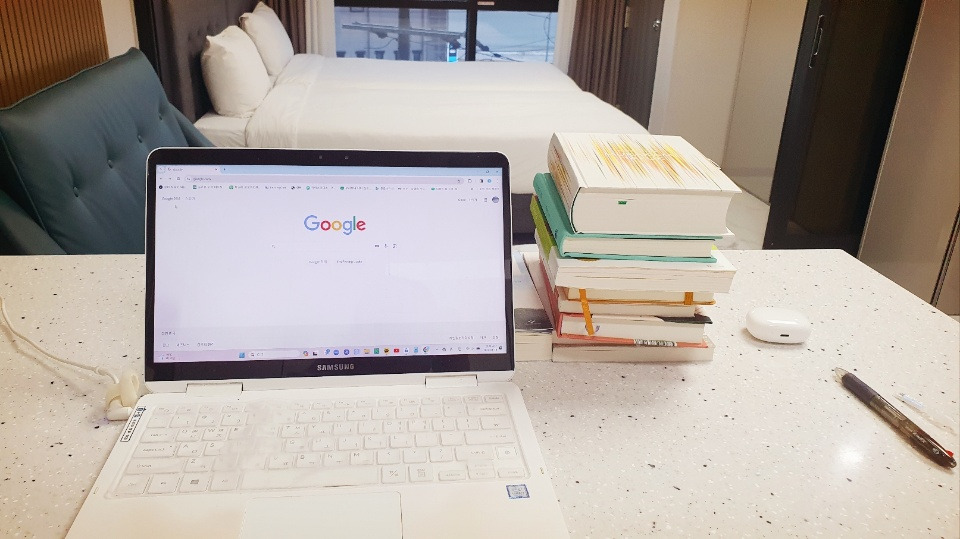 폭신한 침대에서 낮잠을 자거나 OTT와 유튜브를 시청하는 시간이 더 많지만 어쨌든 잠시라도 글을 적기 때문에 알맞은 높이와 너비의 테이블이 반드시 필요하다. 전망, 가격, 객실 컨디션이 아무리 좋다 해도 테이블이 없거나 낮은 곳은 제외한다. 의외로 여러 조건 중 이 조건을 맞추는 게 가장 까다롭다. 테이블뿐 아니라 의자도 함께 본다. 테이블과 의자의 높이가 맞지 않으면 오랜 시간 글을 적을 수 없기 때문이다.