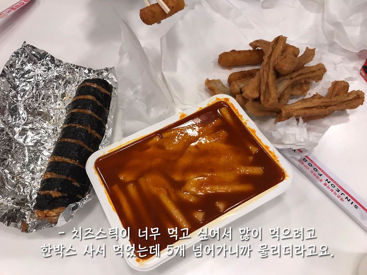 일이 많이 남아서 야근을 했다. 뀰이랑 단둘이 남았길래 뀰하고 신전 떡볶이 배달을 시켰다. 원래 우리가 신전떡볶이를 시킬 때는 '떡볶이 순한 맛+어묵 튀김+김밥' 세트로 시키는데 뀰이 이번엔 치즈스틱도 주문했길래 물어봤더니 요즘 치즈스틱이 너무 맛있다고 했다. 아니나 다를까 치즈스틱을 너무 먹고 싶어서 집에도 한 박스 주문했다고 했다. 뀰은 어떤 게 좋으면 미친 듯이 좋아한다. 방이시장 만두에 꽂히면 그 주에는 만두만 먹는다. 하지만 치즈스틱은 만두의 사랑만큼은 못 간 것 같다.