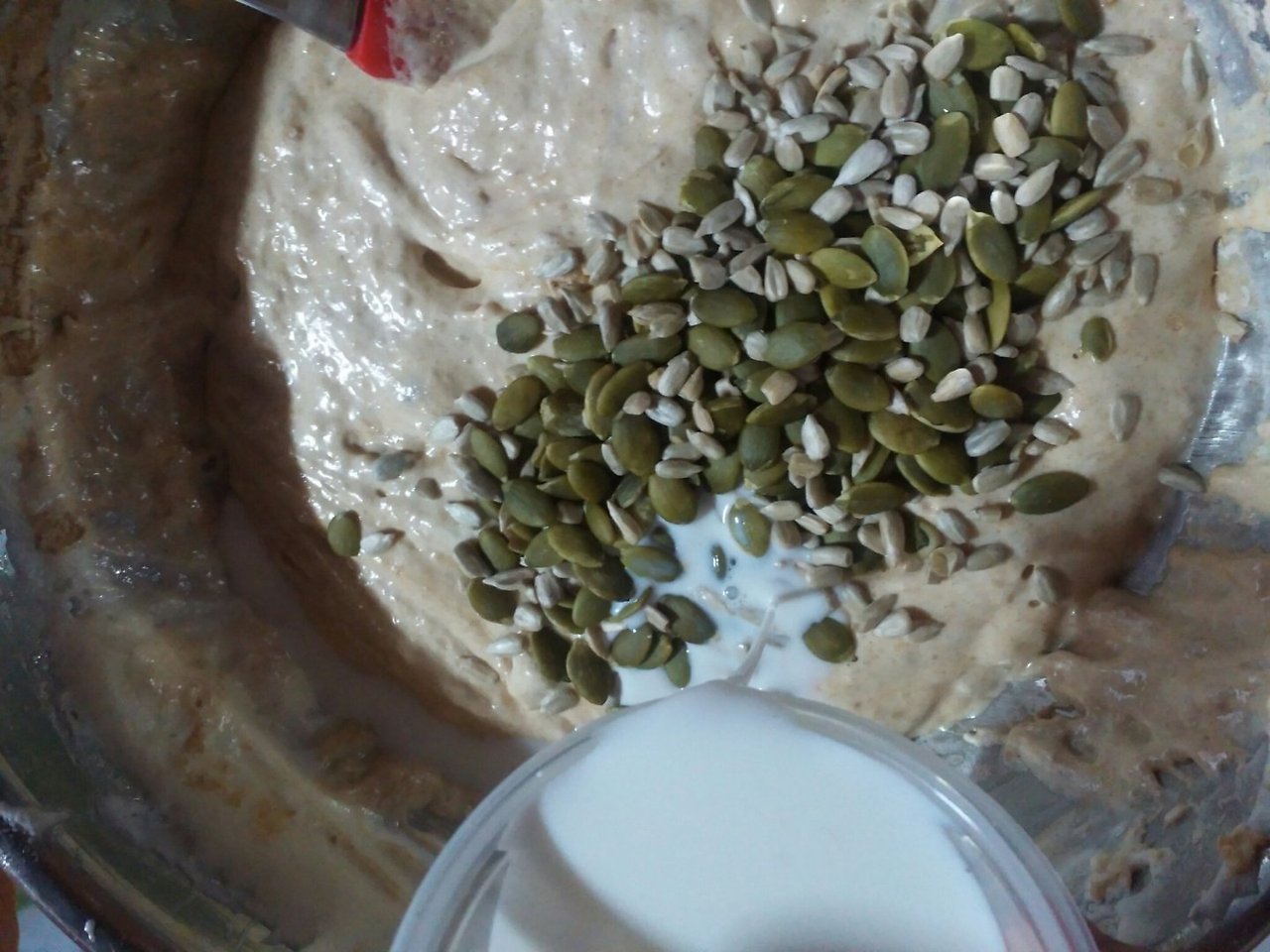 7. 마지막으로 견과류도 넣어주시고 우유도 나눠가며 바닥에 고이지 않게 빠르게 섞어주세요.