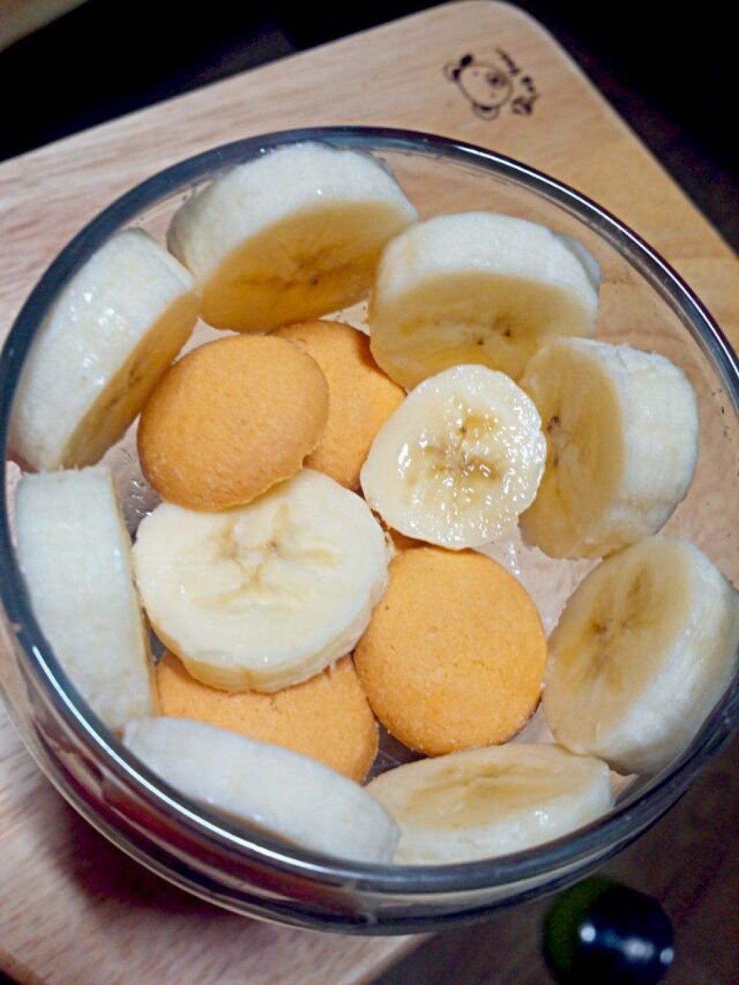 5. 바나나와 계란과자를 컵에 담아주고 3번에서 만들어놓은 우유푸딩재료를 부어주세요.