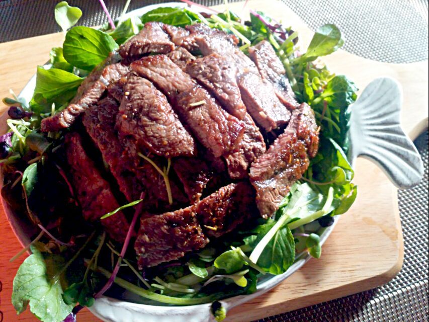 7. 어린잎채소와 스테이크도 썰어서 올려주세요.