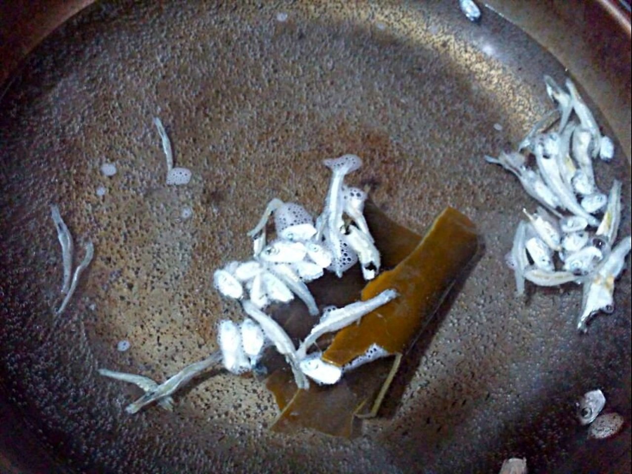 2. 물 1L에 똥 딴 멸치랑 다시마 넣고 육수를 끓입니다.