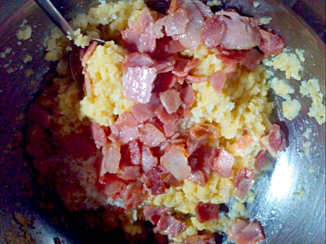 이제 프링글스 갈아놓은 곳에 베이컨칩과 파마산치즈가루를 넣고 잘 섞어주세요.