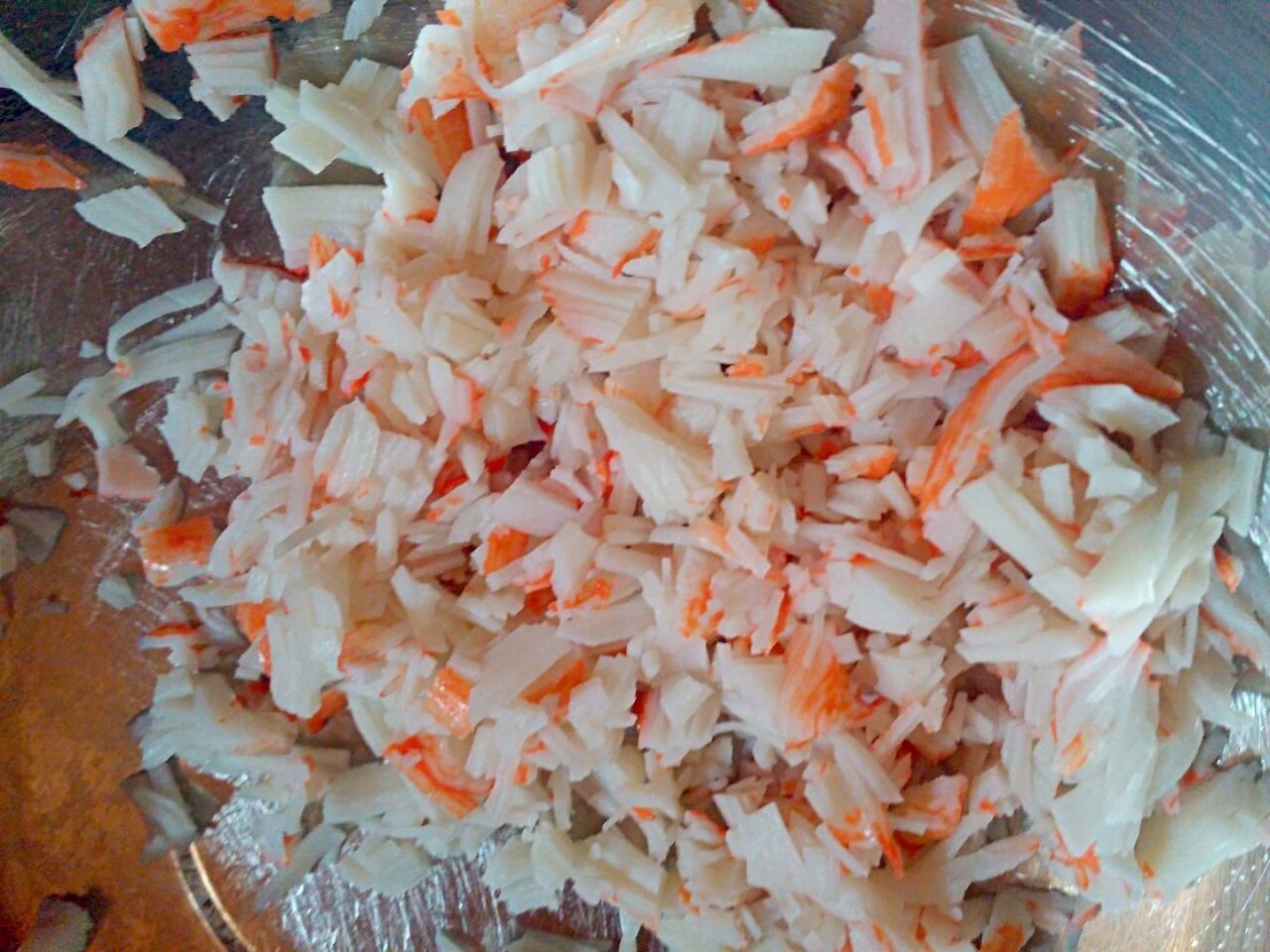 게맛살 먼저 결대로 찢어 가위로 잘게 잘라줍니다.