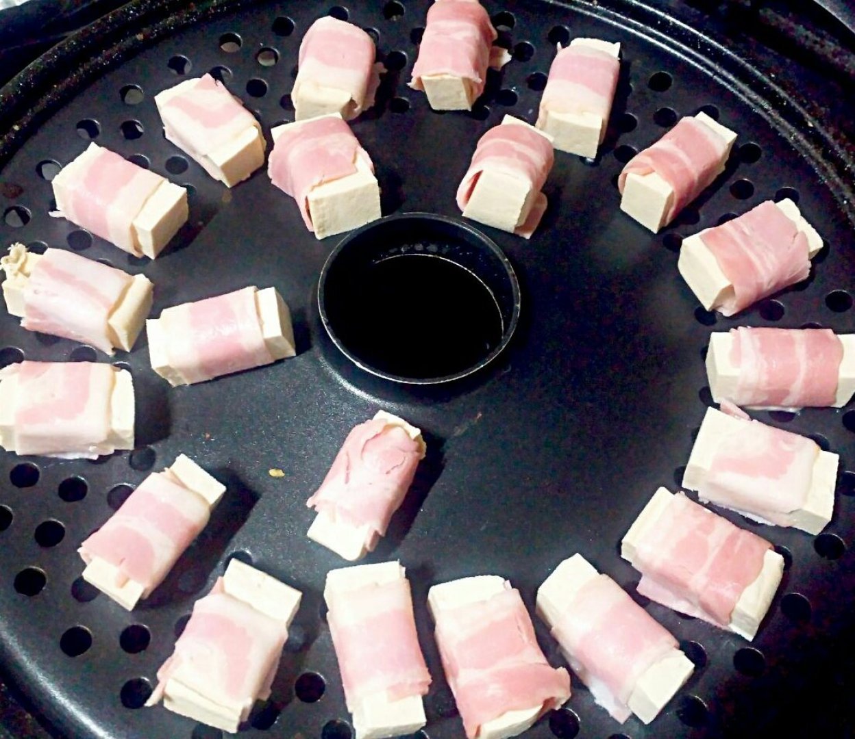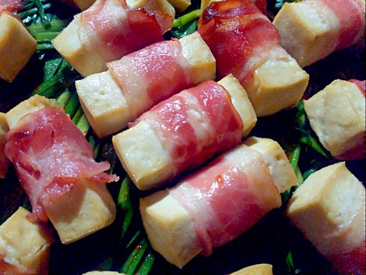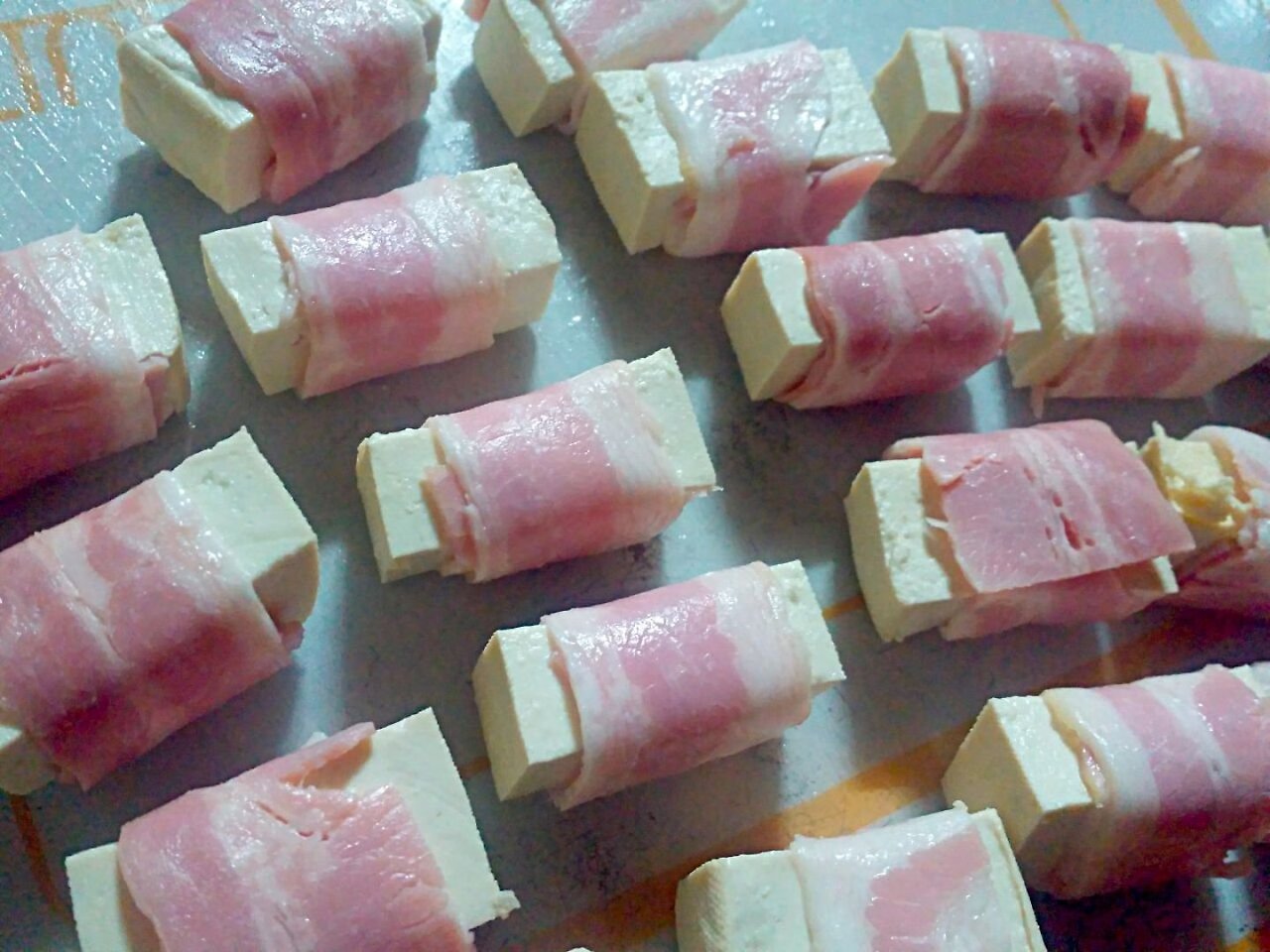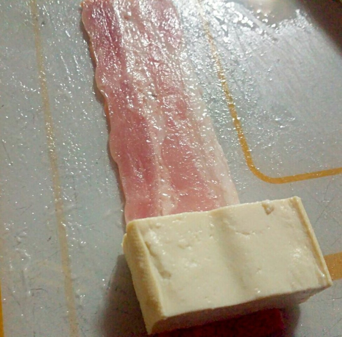 2. 두부 1/5모를 베이컨 1줄에 돌돌 감아주세요.