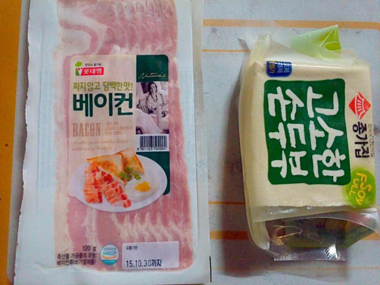 주재료인 두부와 베이컨을 가지고 반찬 두가지를 만들어볼게요.