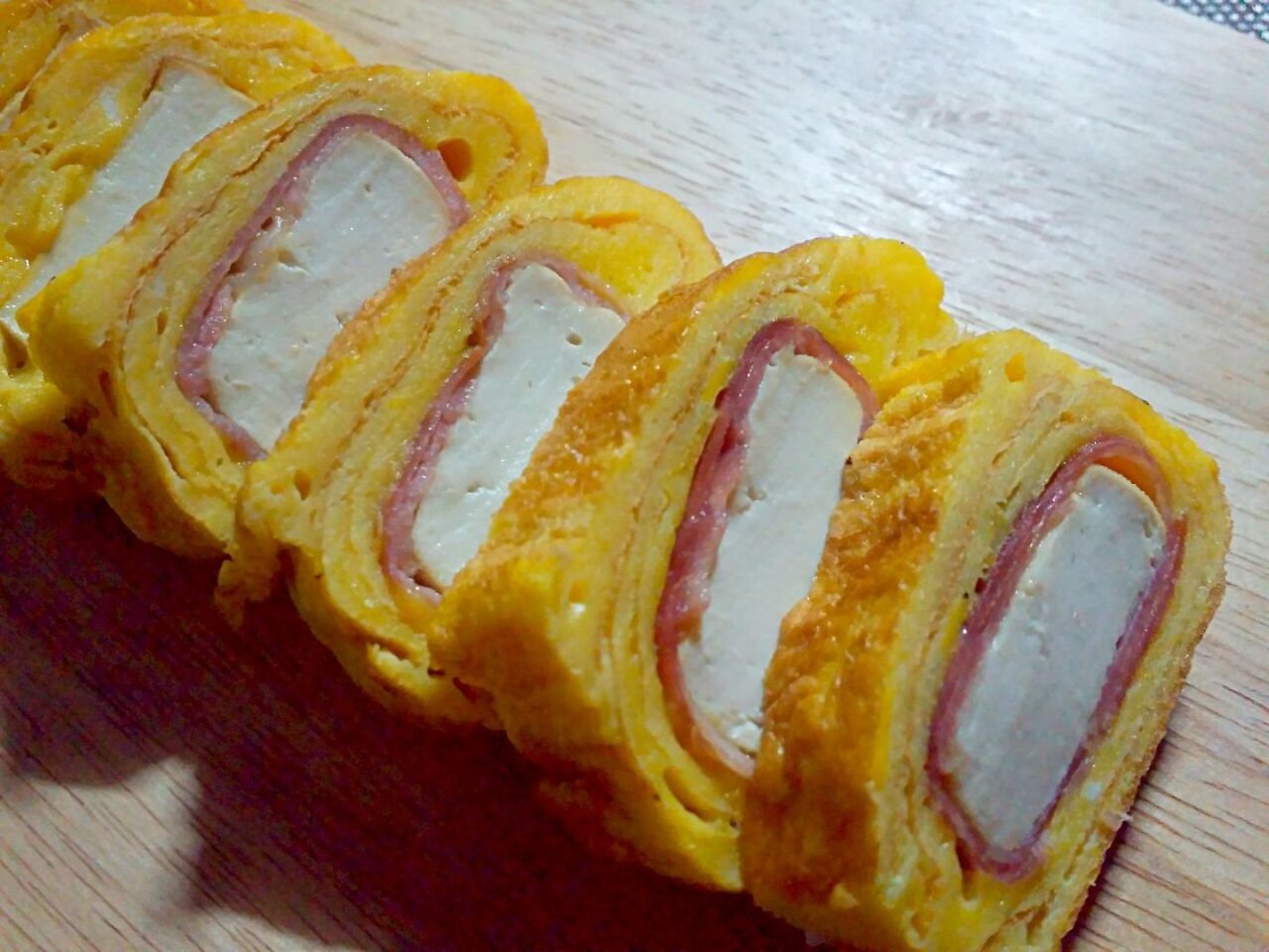 3. 기름 두른 팬에 계란물 부어주시고 베이컨 두부말이 올려서 말아주세요.