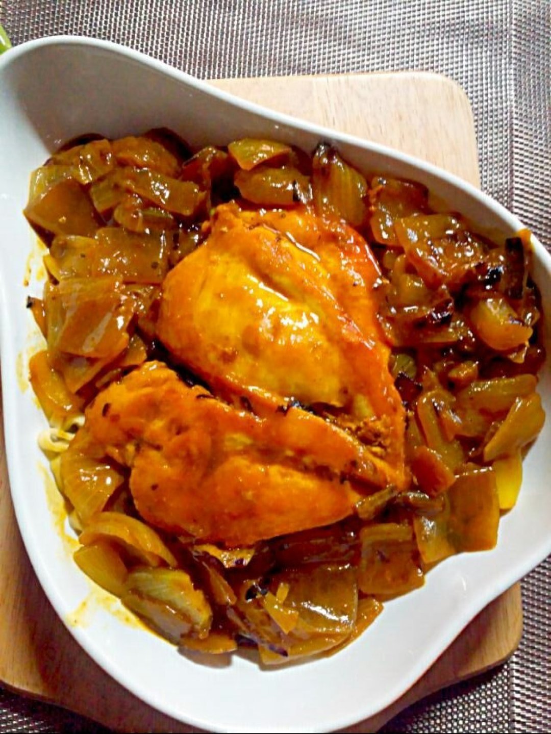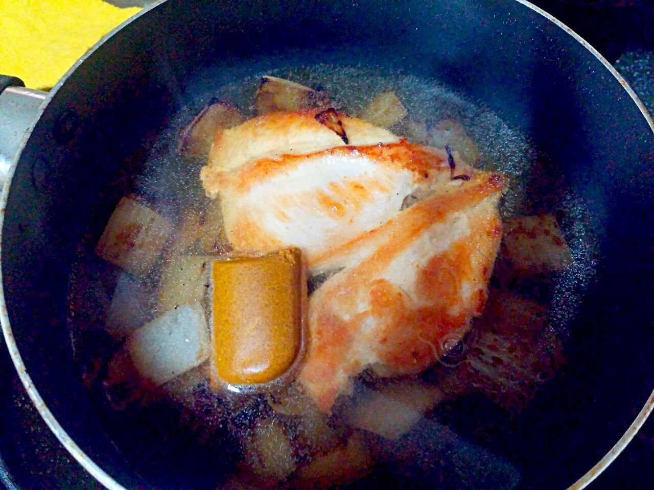 4. 볶아놓은 양파와 닭가슴살에 물2컵넣고 카레1블록 넣어 끓여줍니다.(카레완성)