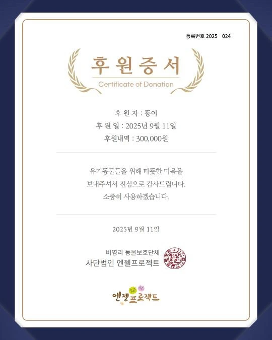 9월 11일. 뚱이의 첫 하늘생일, 다시 만나는 그날까지 뚱이를 더 이롭게 하겠다는 스스로의 다짐대로 그동안 정기 후원하던 곳 중 한 곳에 뚱이 이름으로 후원금을 전달했다.