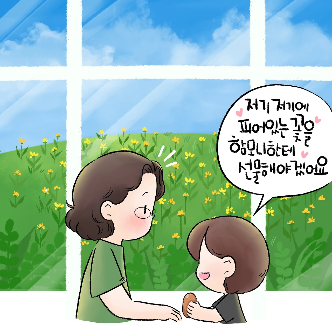 "저기 저기에 피어 있는 꽃을 함 모니한테 선물해야겠어요."