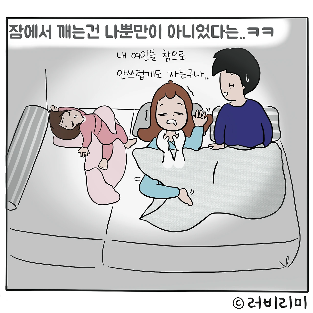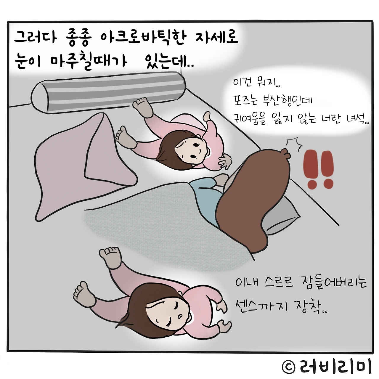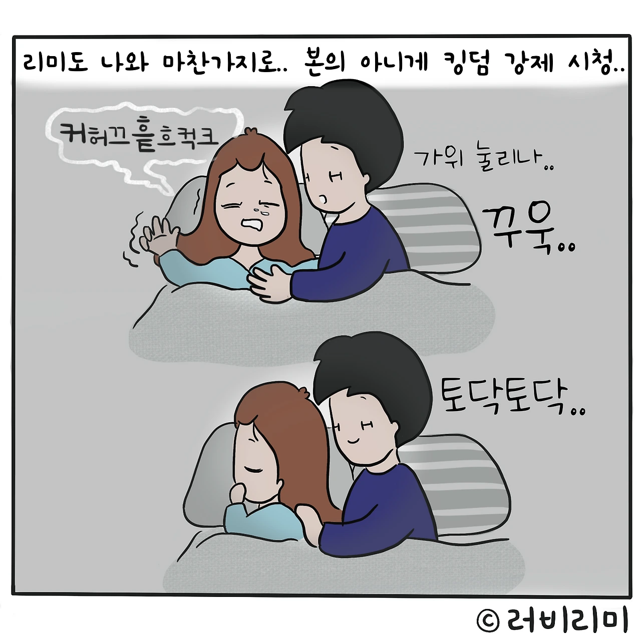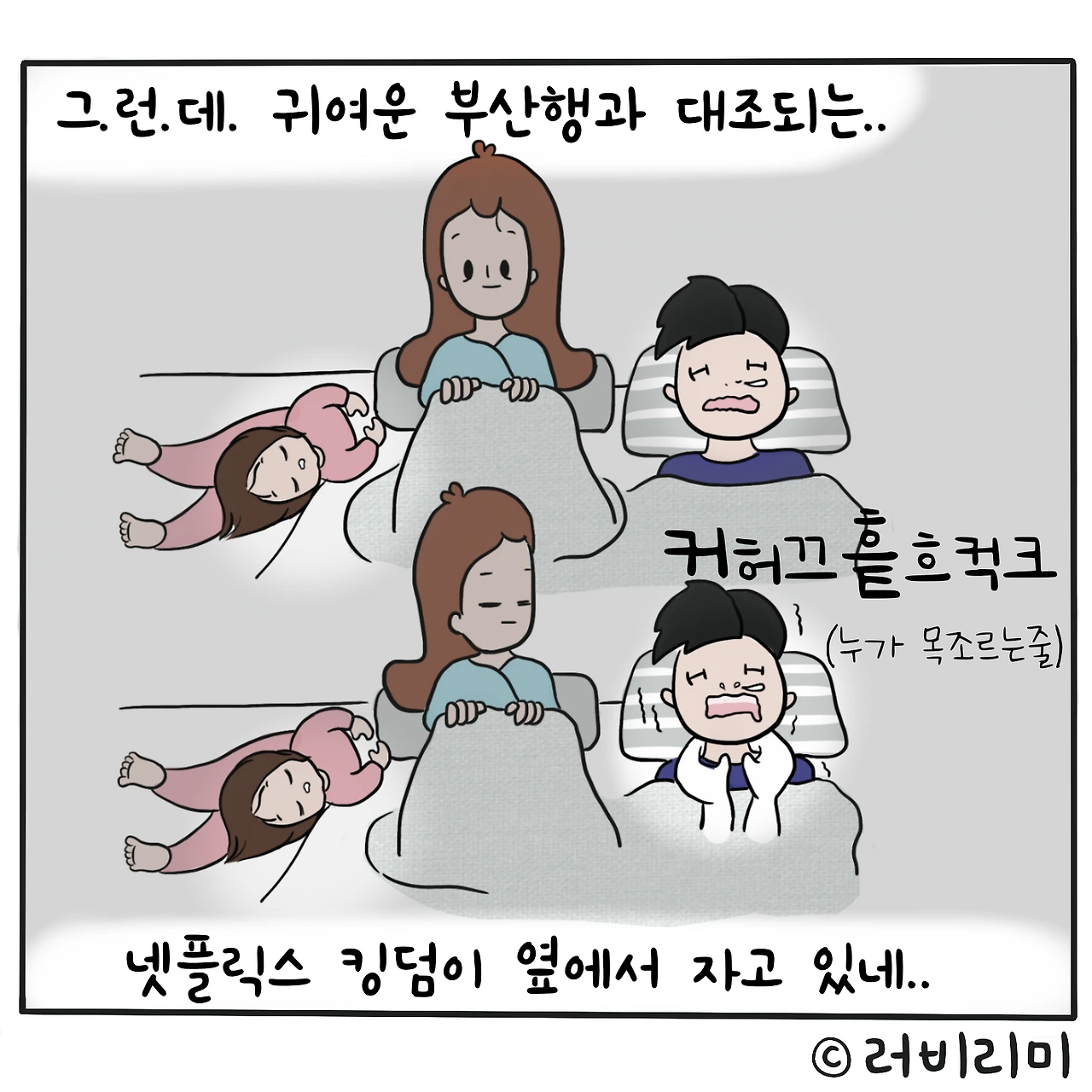 # 당신이 잠든 사이에..자다가 깨면 귀여운 미니와 가여운(??ㅋㅋ)리미 사이에서부산행, 킹덤 동시 상영 즐기던 나였는데..뭥미!!!나도 나름 주연배우였어..ㅋㅋㅋㅋㅋㅋㅋㅋ그걸 나만 몰랐네 아놔..나 절대 코도 안골고 얌전히 잔다고 자부했는데..풉..킹덤 오브 육아..그만큼 험난한 곳이었으....-#러비리미 #킹덤 #부산행 동시 상영중 ㅋㅋ -