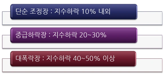 10%내외의 주가지수 하락으로 마무리 되는 단순 조정장, 20~30%수준의 주가지수 하락이 전개되는 중급하락장 그리고 모든 이들을 공포에 몰아넣는 주가지수가 40~50%이상 하락하는 대폭락장이 바로 그것입니다.