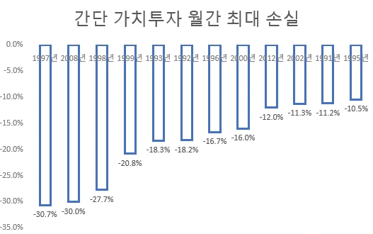 과거 2008년 금융위기 당시 월간 30%하락하기도 하였고, IMF가 지나가던 97년과 98년에는 27~30%의 하락률이 있기도 하였습니다. 90년대에는 수시로 월간 15%이상 하락하기도 하였습니다. 2012년에 한번 12%월간하락률이 있기도 하였습니다만, 아마 대다수의 가치투자 방식들의 올해 10월 손실은 이보다 더 큰 14~18%수준일 가능성이 큽니다.