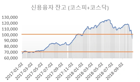 그 레버리지 투자의 바로미터인 신용융자 잔고가 올해 초 수준을 하회하며 9조3천억원까지 줄어들었습니다. 하지만 아직도 2017년 초 수준인 7조원까지는 2조3천억원이 남아있기 때문이 이 물량들이 산발적으로 증시에 부담을 안겨줄 가능성이 있습니다. 물론 이번 10월 장을 거치면서 쏟아졌던 것처럼 급격히 쏟아지지는 않겠지만 몇가지 부담스러운 시나리오를 추정 해 볼 수 있습니다.