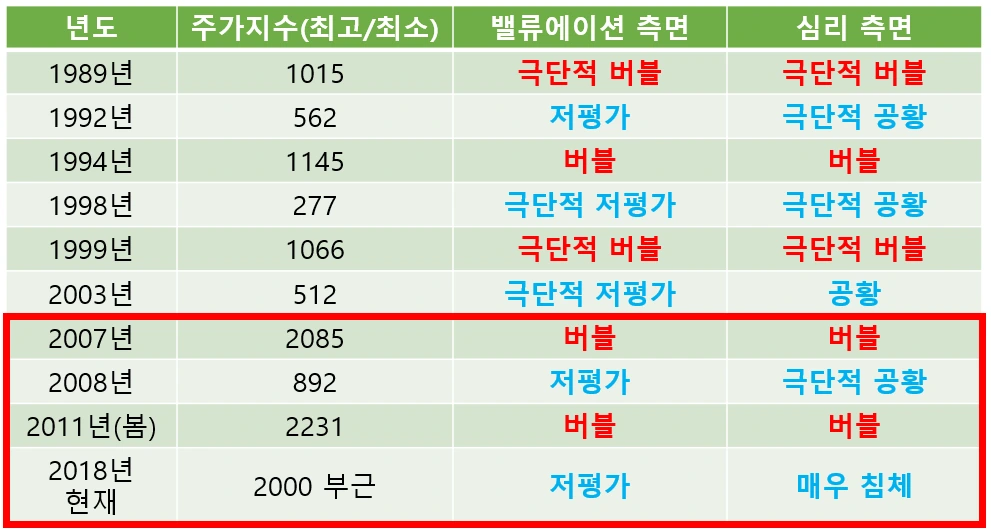 이를 표로 정리하여보았습니다. 주식시장에 밸류에이션 측면 그리고 심리적 측면에서는 버블/침체가 비슷하게 반복되어왔습니다. 특히 밸류에이션 측면에서의 변화를 보다보면 주가지수 500,1000,2000p가 가지는 고평가/저평가 여부를 가늠 해 볼 수 있겠습니다.