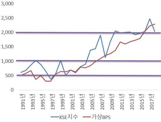 그리고 지금 2018년.... 한국증시의 시장BPS는 2281p까지 올라서 있고 주가지수는 이보다 약 10%낮은 2000p부근에서 맴돌고 있습니다.