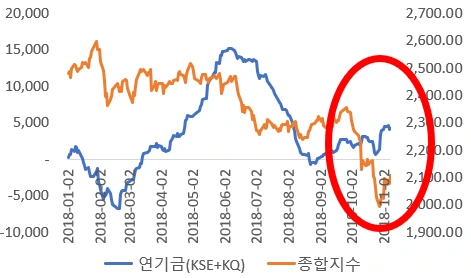 여기에 올해 여름 장에서 증시 하락 과정에서 국내 주식 비중을 낮춘다며 매도세로 일관했던 연기금이 주가지수가 2000p 초반까지 하락한 이후로는 매수세를 다시 만들고 있습니다. 아직은 미약할 수 있습니다만 아마 낮추어진 국내 주식 비중으로도 제법 많이 국내 주식을 사야할 상황입니다.(저의 계산으로는 주가지수 2100p 기준 6조원 추가 매수 해야하는 것으로 추정됩니다.)