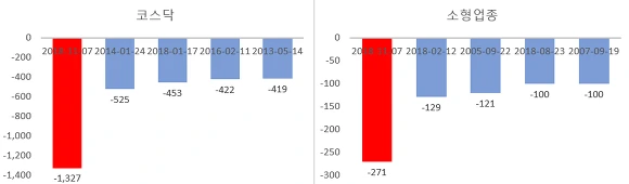 어제 장중 내내 쏟아진 연기금의 매도는 결국 코스닥 시장과 소형주에서의 사상 최대급의 매도규모를 만들고 말았습니다. 2008년 금융위기 때에도 연기금이 이렇게 매도한적이 없었는데 하루만에 코스닥시장에서 1300억원대, 소형업종에서는 270억원대 순매도를 만들었다는 것은 무언가 이상하게 느껴질 정도였습니다.