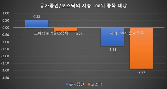 코스닥시장의 시총 상위 100종목의 경우(주확색 막대), 고배당수익률 30종목은 평균 -0.26%정도만 하락하였지만 배당수익률이 낮은 30종목의 경우는 평균 -2.87%하락이라는 큰 낙폭을 보이고 있었습니다.