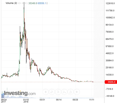 [필자의 친구가 투자한 Q모 가상화폐, 고점대비 1/40 수준으로 폭락했다. 자료참조 : investing]