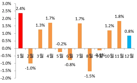 그래서 위의 표를 다시 살펴보았습니다. 1월의 평균 등락률이 2.4%로 가장 높은 값을 보여주고 있습니다.