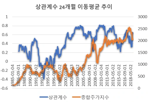 그런데 이러한 한국과 미국 증시 간의 상관관계가 항상 같은 값을 보인 것은 아닙니다. 시장 상황에 따라 높아지기도하고 낮아지기도 합니다. 이러한 특징을 시각적으로 구분하기 위하여 위에 종합주가지수와 월단위 상관계수의 24개월 이동평균 도표를 준비하였습니다.